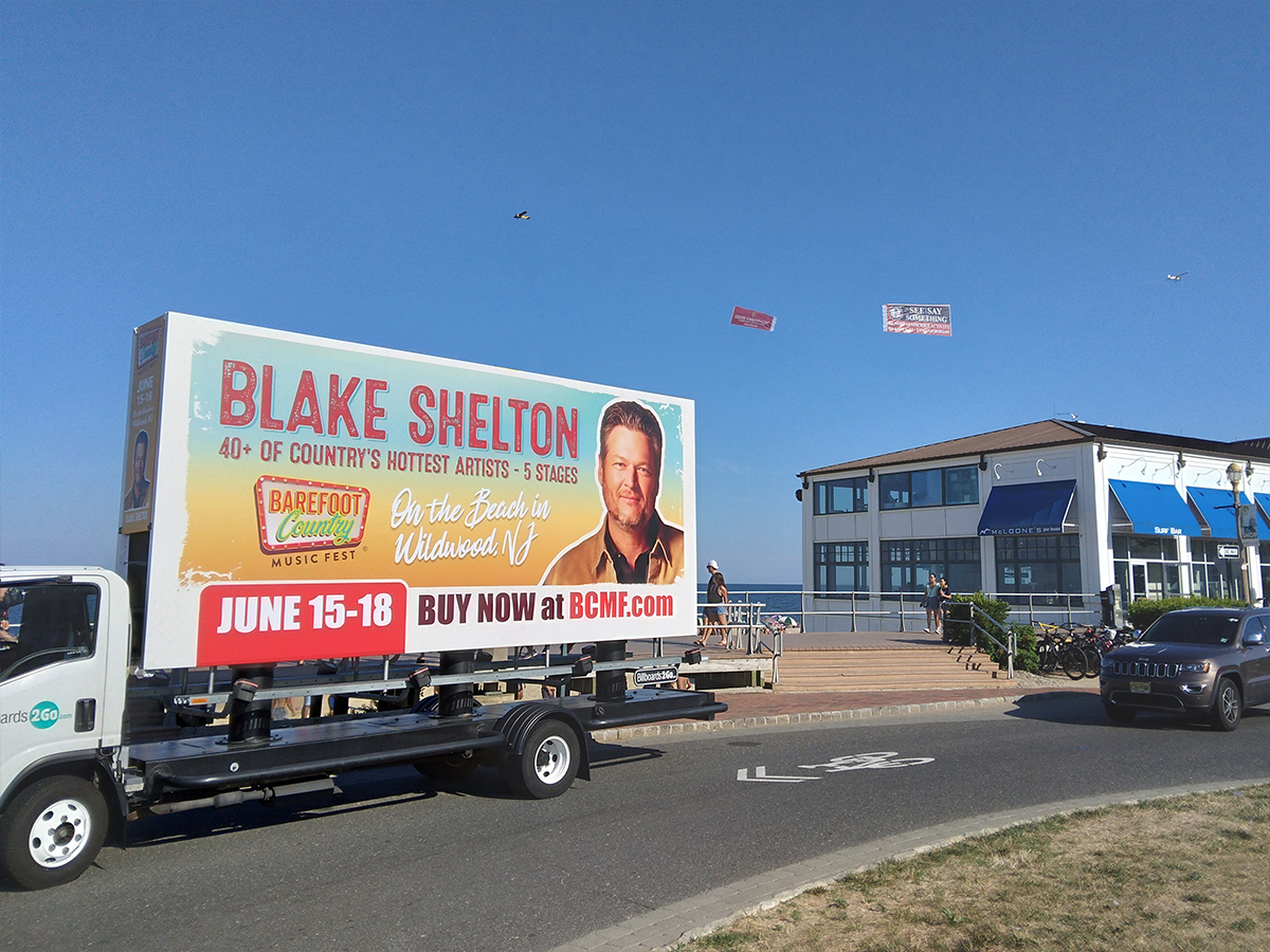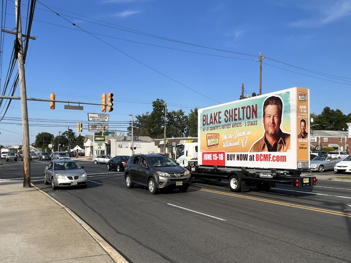 NOTE: 08/19/22 The focus of the campaign will be concentrated with in the designated geographical market as shown on the map above. The proposed routing for this Saturday and Sunday is as follows: Saturday 8/20: We will start at 12PM and run until 8 pm. Your billboard truck will make its way down to Jersey Shore towns, focusing in and around Long Branch Beach which is a very congested, popular area. There will also be stops at the Monmouth Park Music Festival and we will finish up at the PNC Arts Center for the tailgating festivities that lead up to the Styxx/Foreigner concert. On Sunday, 8/21 (12PM-8PM) your billboard unit will roam Jersey Shore towns, finishing up near Point Pleasant Beach for the Big Joe Henry New Jersey 101.5FM radio simulcast. This event usually draws very big crowds. During the campaign, you may see your billboard unit on Ocean Boulevard quite frequently since that is usually a bumper-to-bumper crawl from one beach to the next. Other markets TBA.