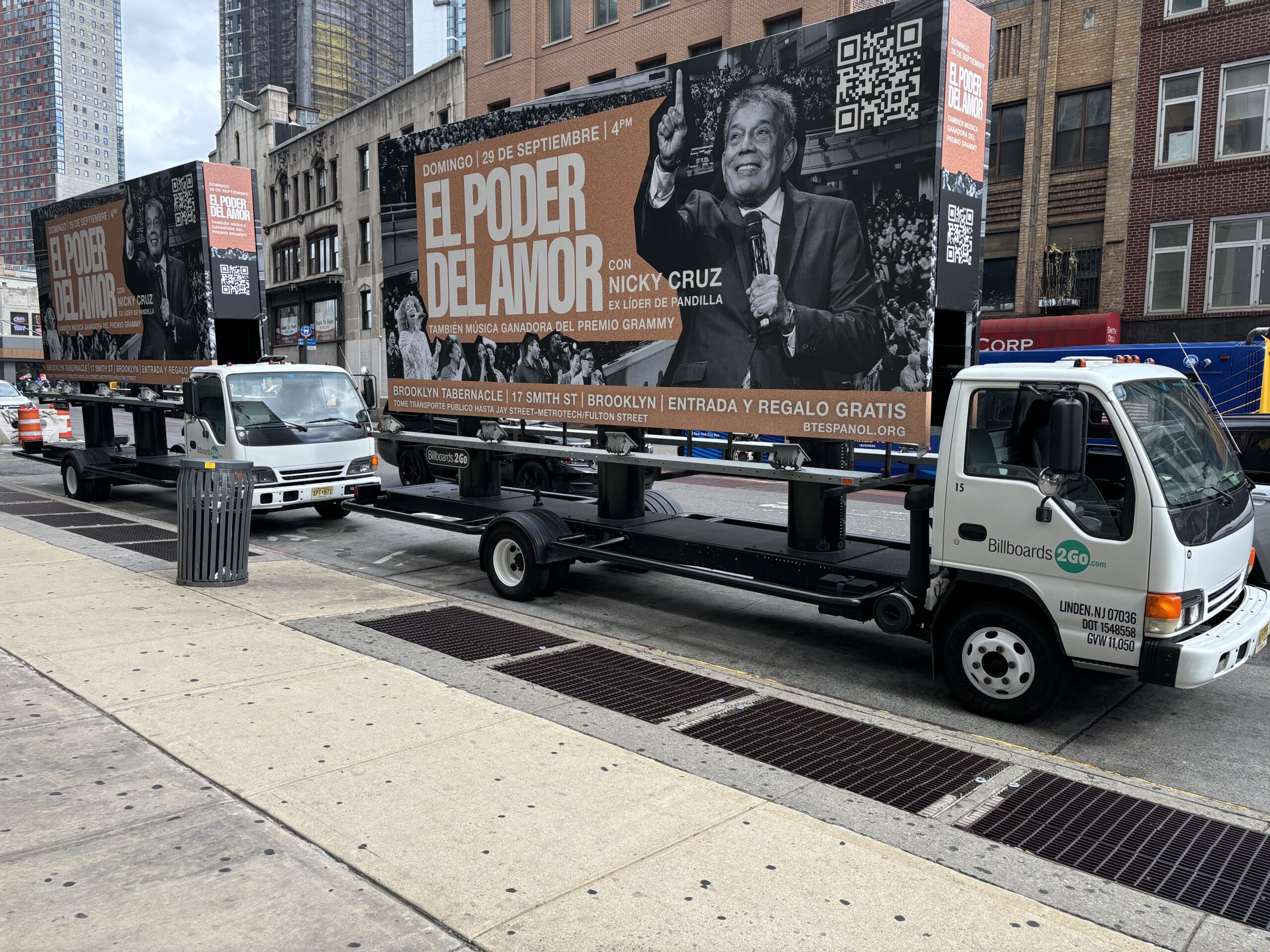 NOTE: 09/17/24 The focus of the Brooklyn Tabernacle – El Poder Del Amor mobile billboard campaign will be concentrated in spanish auidences in Brooklyn Queens & the South Bronx . Specific Mobile Billboard routing suggestions will be taken into consideration before and during the campaign.