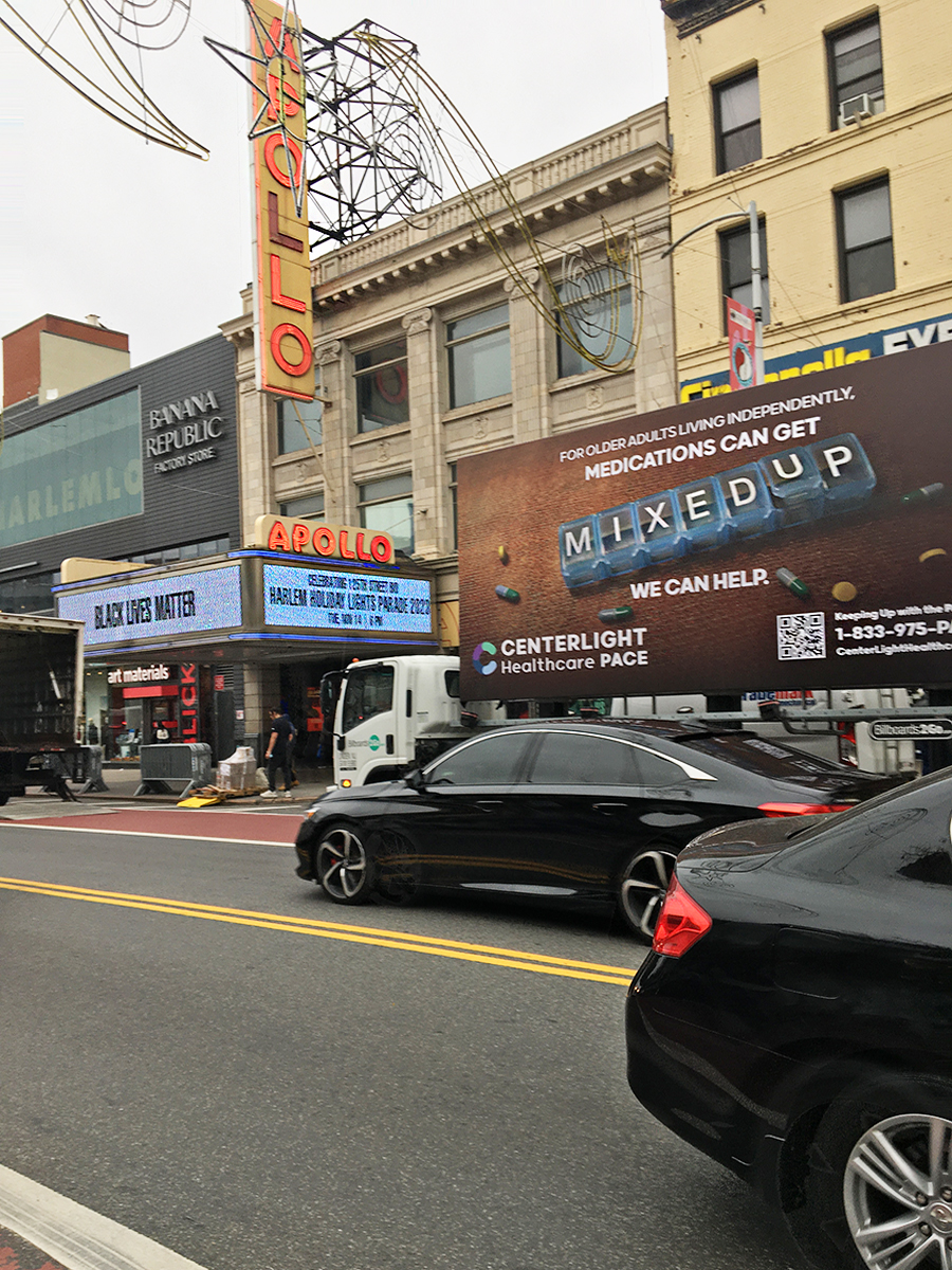 NOTE: 11/10/23 Today, the Centerlight Healthcare mobile billboard gained visibility in upper Manhattan and the Bronx. The accompanying photos highlight the billboard strategically placed near two iconic city landmarks: the Apollo Theater on 125th Street in Harlem and in front of Yankee Stadium in the Bronx. The final image displays a screen capture of today’s GPS route, captured around 5:30 PM, illustrating the path taken by the billboard throughout the day.