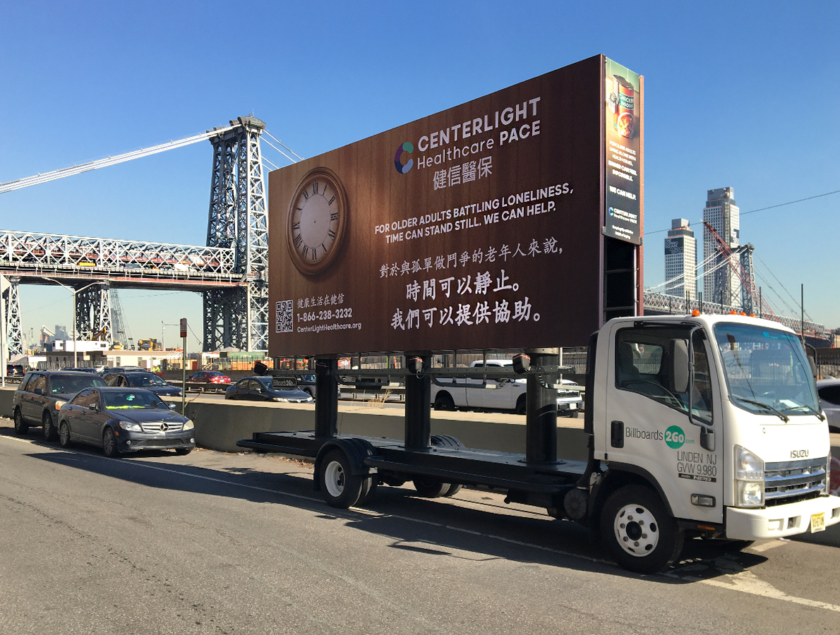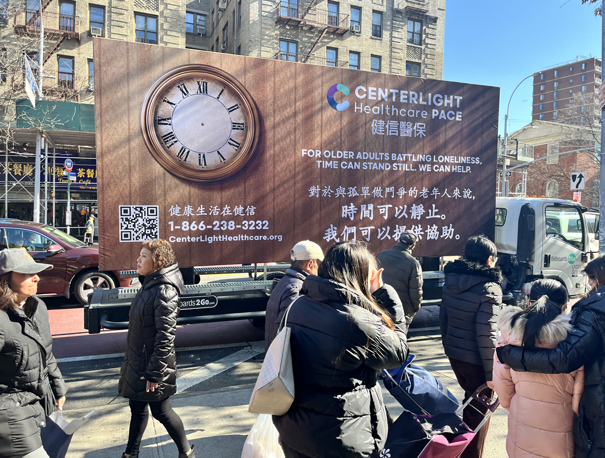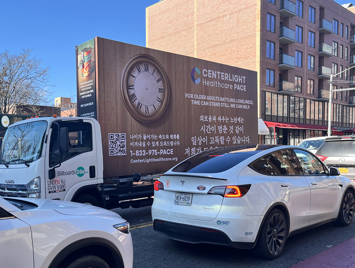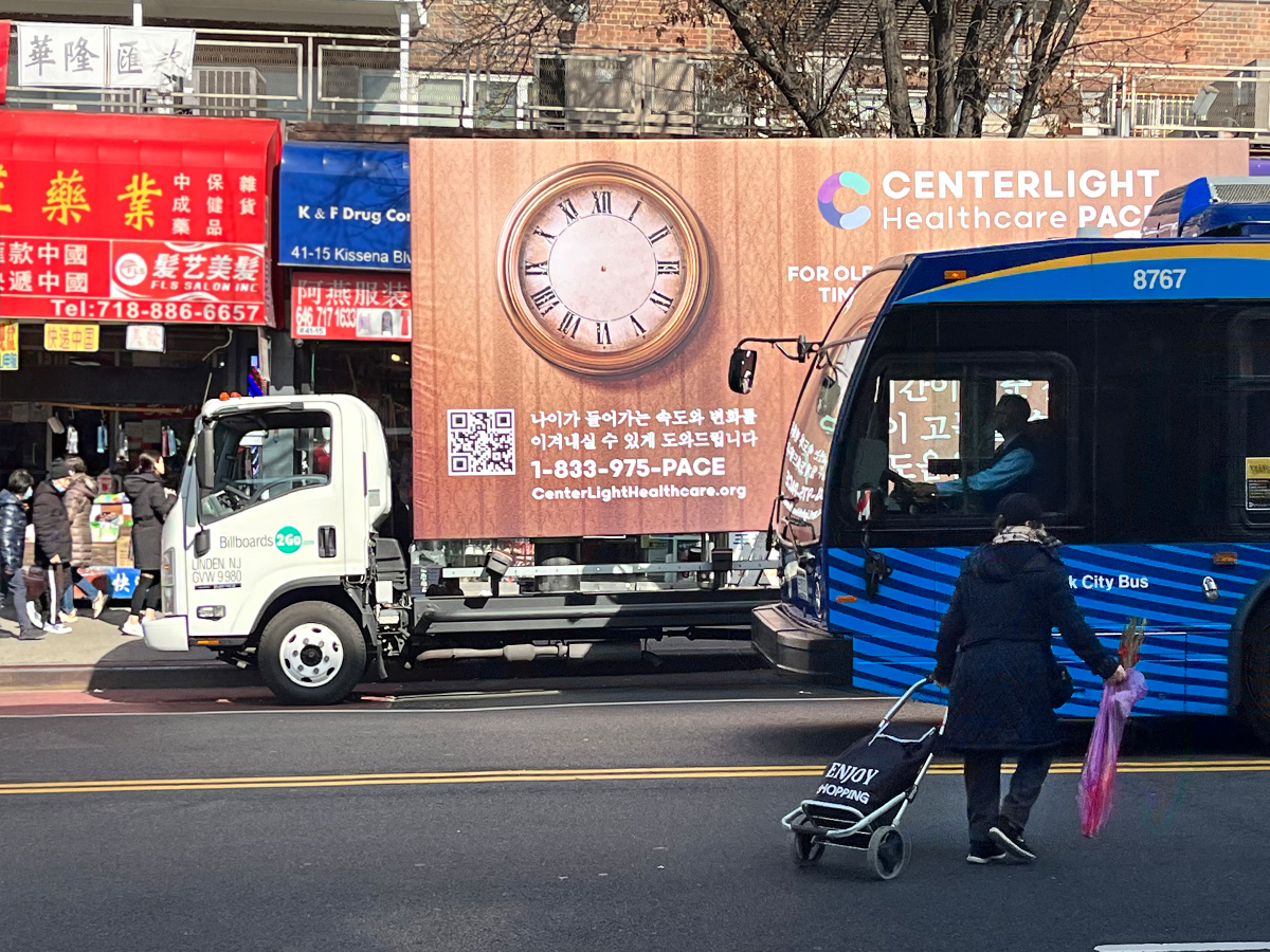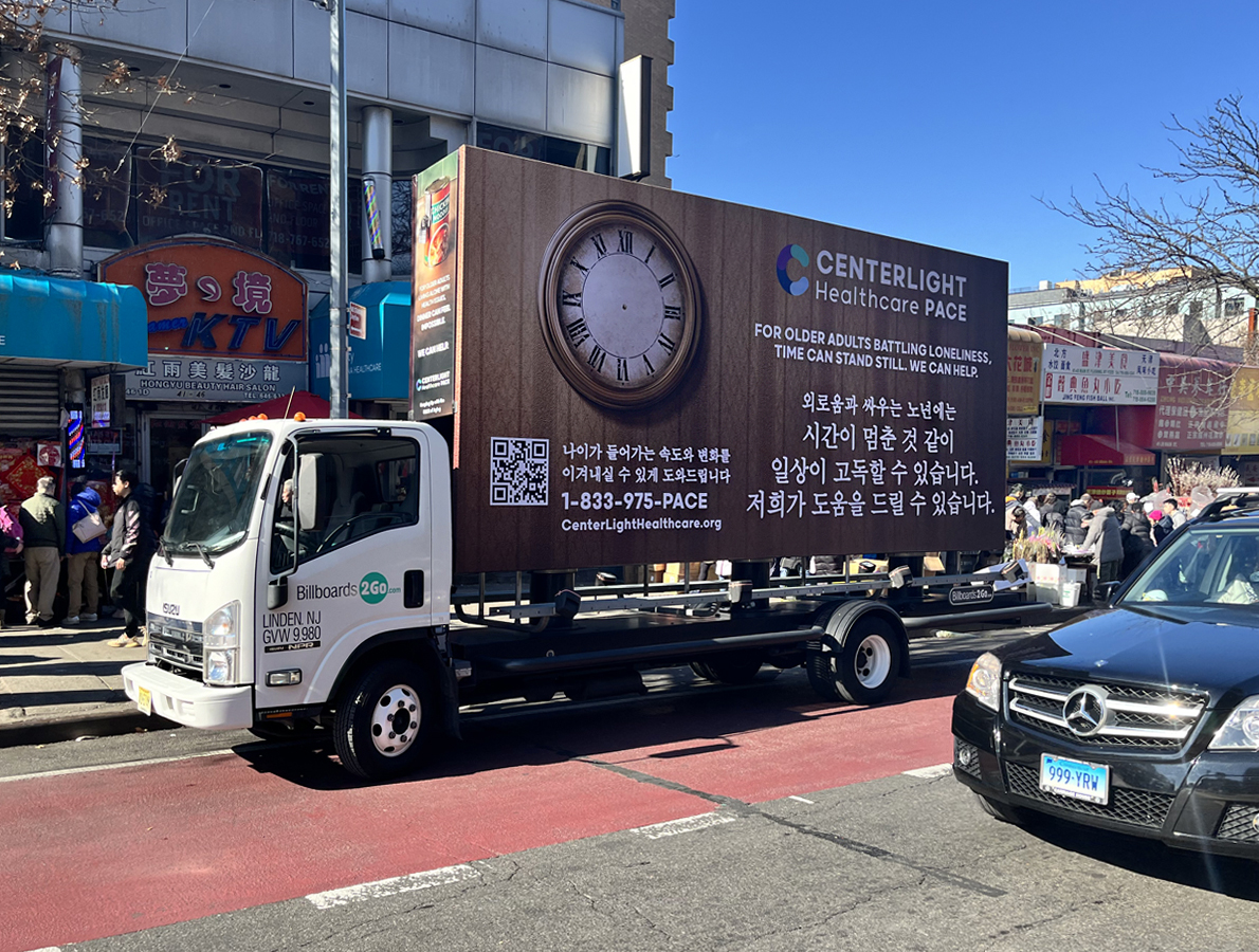 NOTE: 02/09/24 Exciting news! Billboards 2Go successfully met the tight production deadline for yesterday’s event in Manhattan’s Chinatown. While the billboard driver didn’t capture many photos, he mentioned that there were plenty of CenterLight Healthcare staff present who may have taken more. We’ll aim to include additional photos from the event soon. In the meantime, please find a photo below showcasing the Chinese side of the billboard unit. Also, we’re currently working on creating a detailed route schedule, which we hope to have ready as a printable PDF file by the end of day. As for today, The Chinese/Korean billboard unit is currently getting exposure in the Flushing Queens market, and the 2nd unit is in downtown Manhattan.