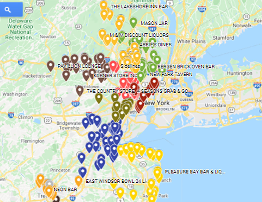 NOTE: 09/28/21 The focus of the campaign will be concentrated within the designated geographical market as shown on the maps above. The map directly above was created using the the vendor list provided by Marketsmith during the 2017 Quick Draw campaign. The color designations are territory grouping of the vendors for logistical purposes. In the 2017 campaign, there were two billboard trucks that split the state into North and South regions. This campaign is significantly smaller so we intend to concentrate on the heavily populated Northern New Jersey region.
