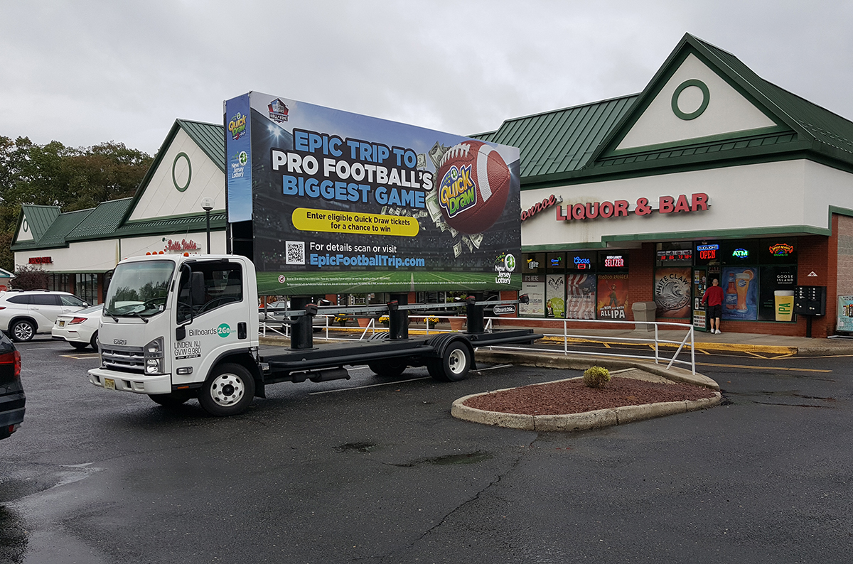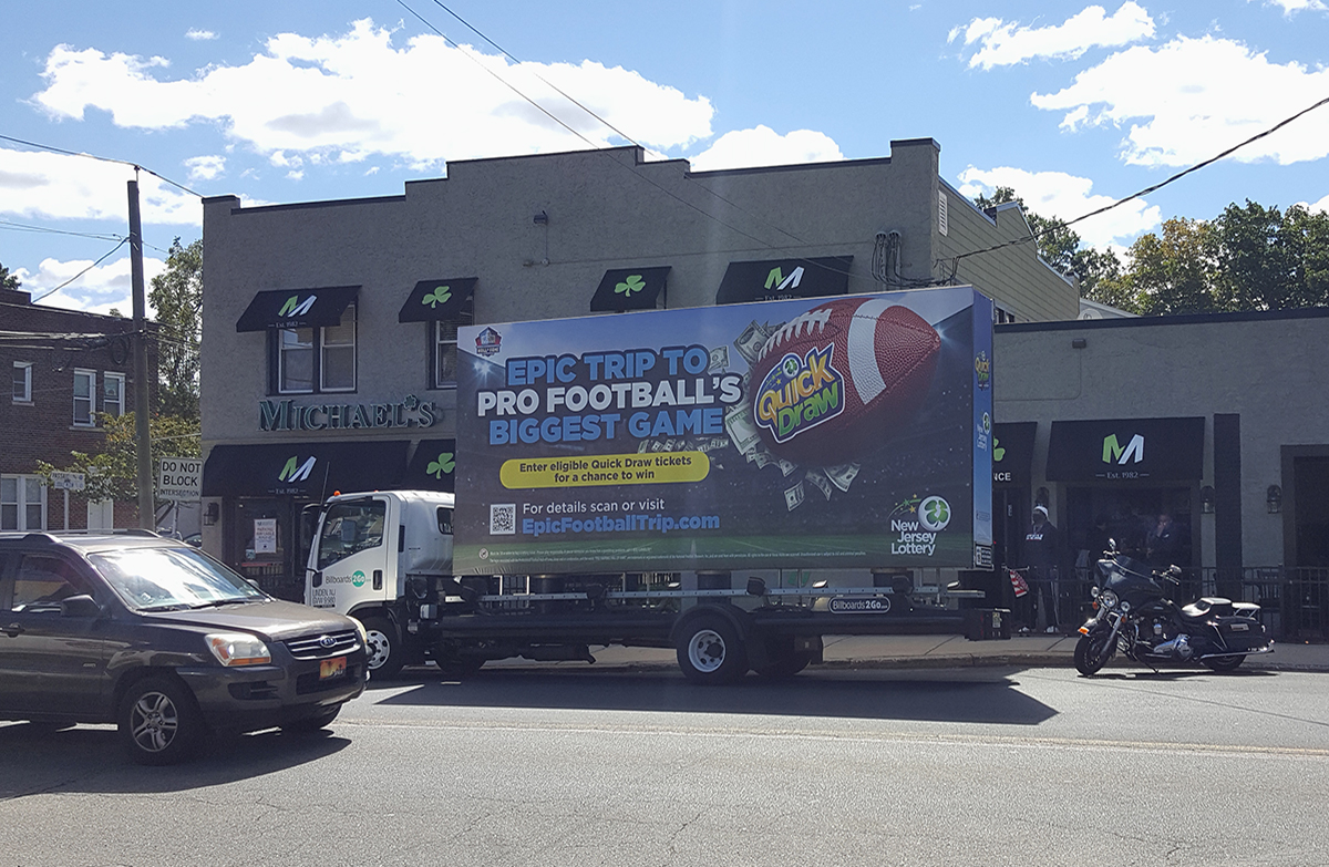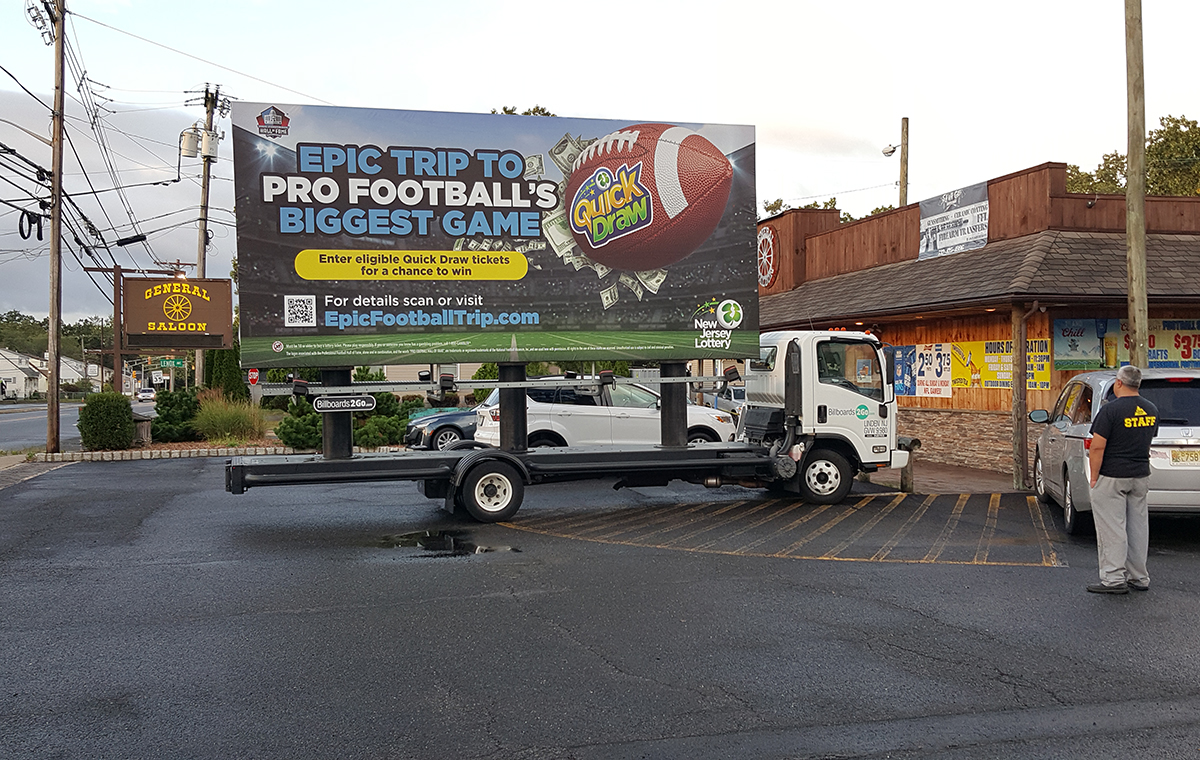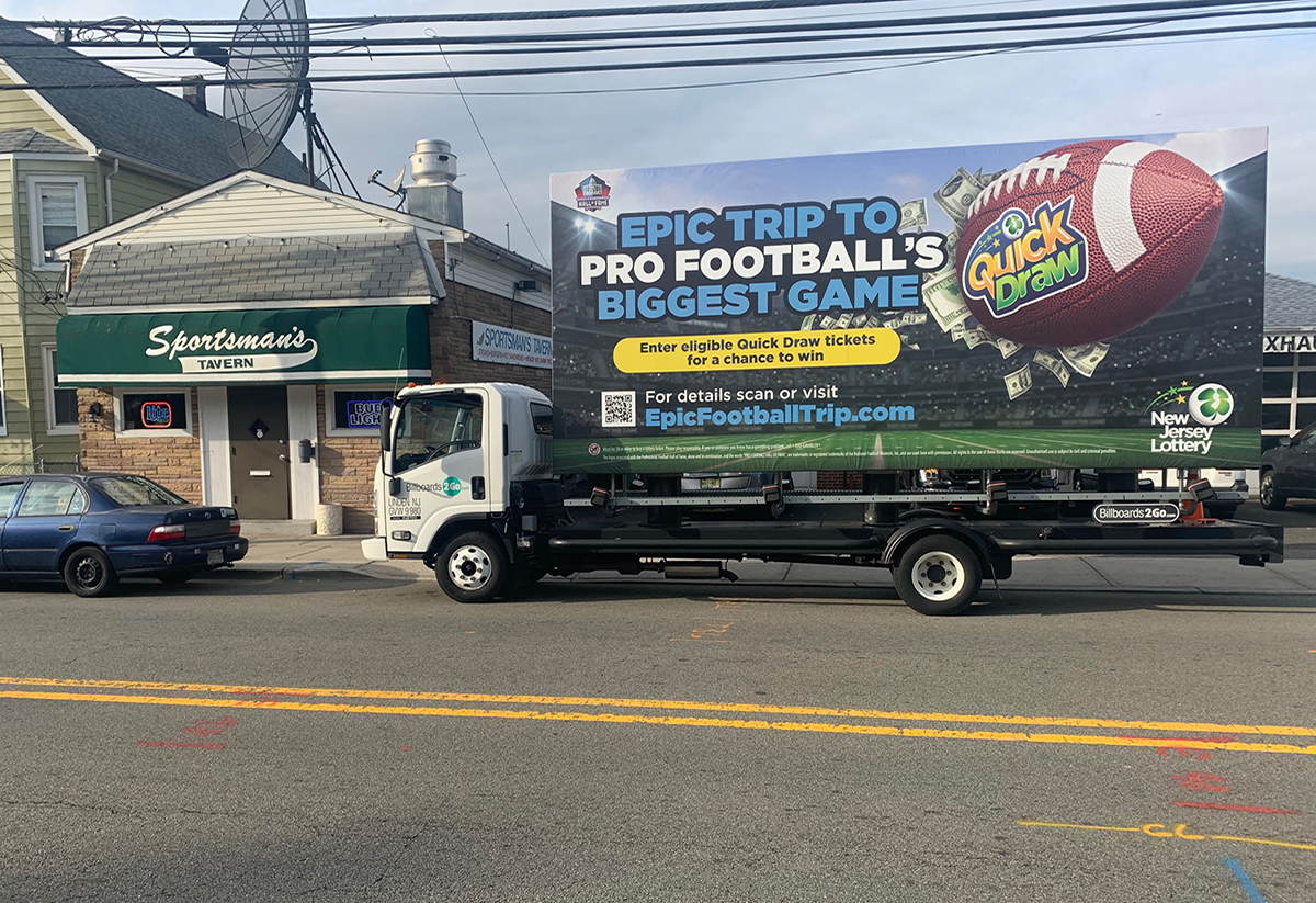 NOTE: 09/28/21 The Quick Draw Football NJ Lottery mobile billboard unit is being posted and will be ready to roll out on schedule for Sept 29th. Photos to follow when available. The single photo below was taken at the Linden NJ depot showing the main side banner art.