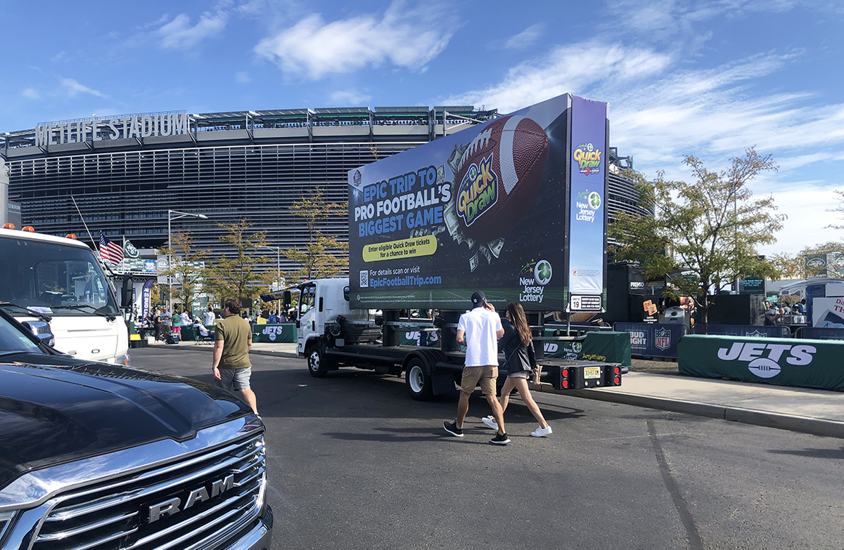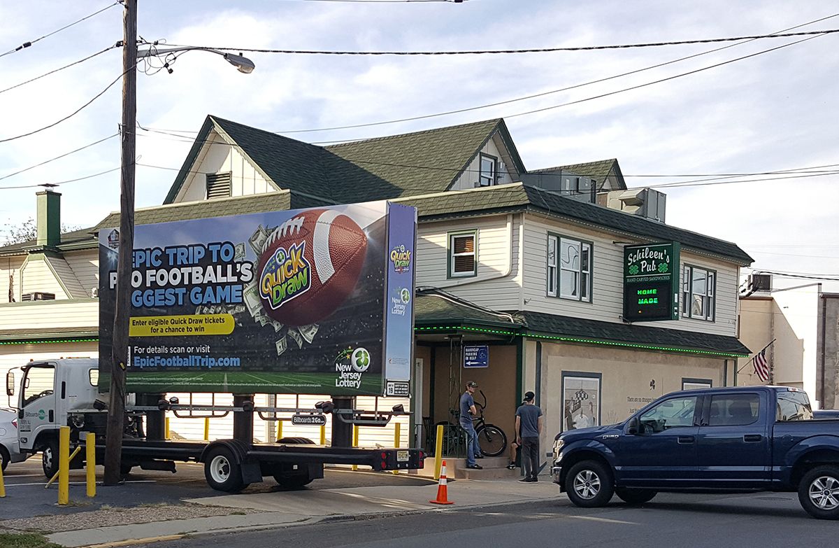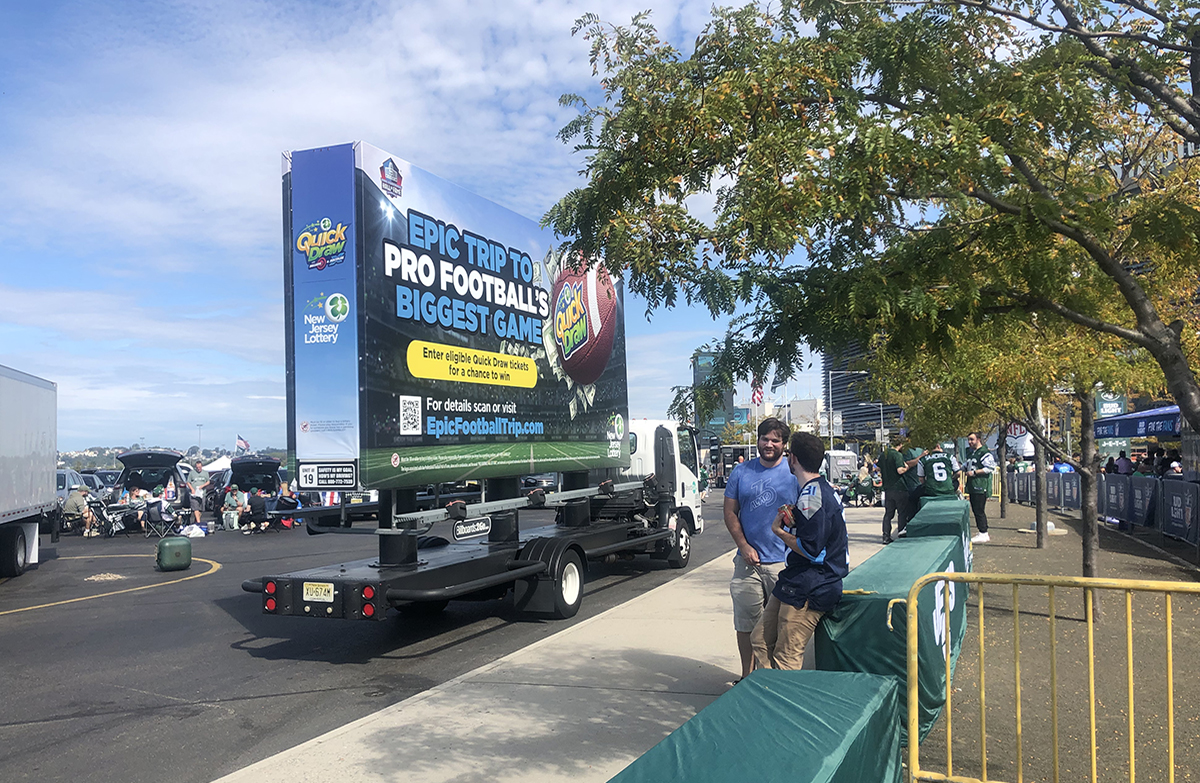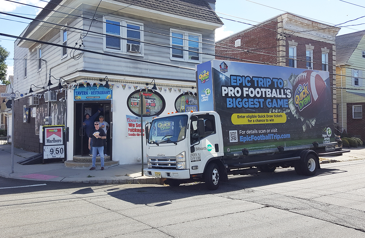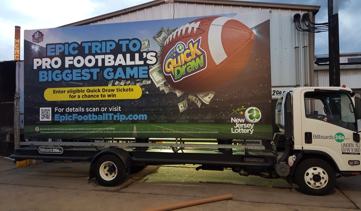 NOTE: 09/28/21 The Quick Draw Football NJ Lottery mobile billboard unit is being posted and will be ready to roll out on schedule for Sept 29th. Photos to follow when available. The single photo below was taken at the Linden NJ depot showing the main side banner art.