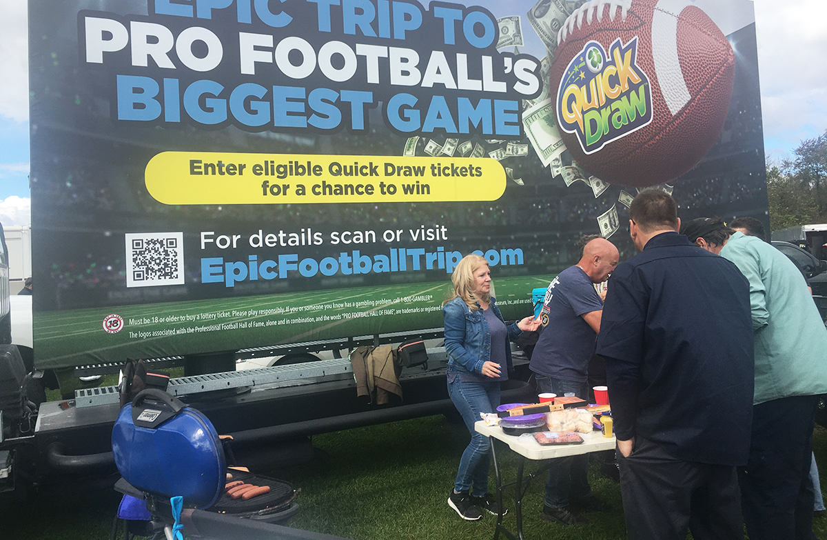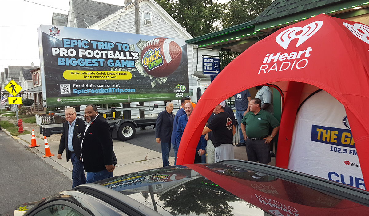 NOTE: 10/15/21 The Quick Draw Football NJ Lottery mobile billboard showed up in style at the special event yesterday at Schileen’s Pub Westville, NJ. The huge billboard was complimentary to the other displays in front of the sports bar. Shown below (far left) is Ron Jaworski, the famous Football Quarterback and sports analyst.