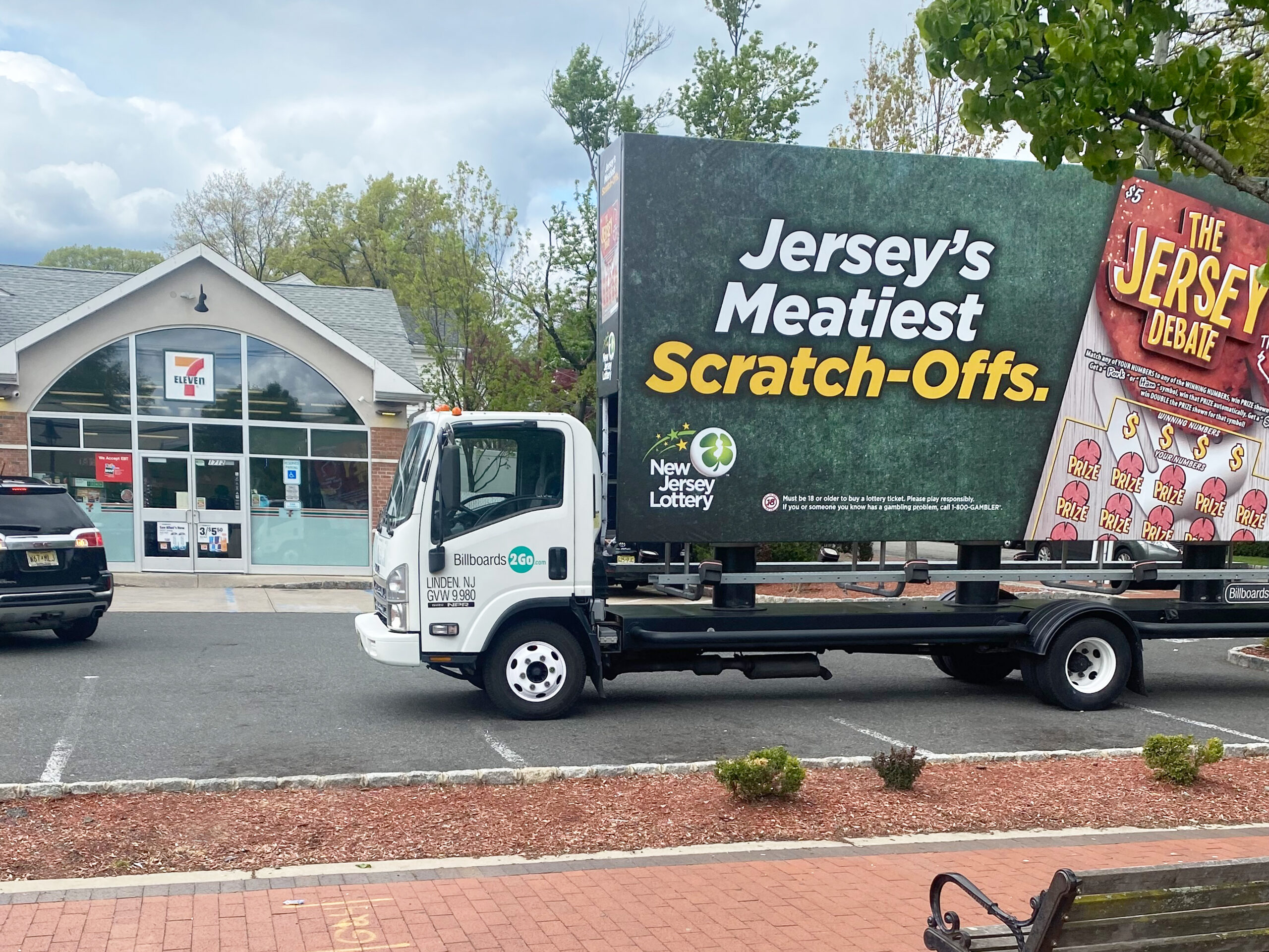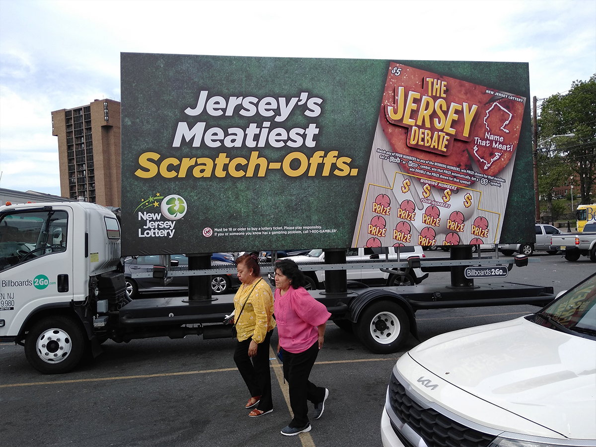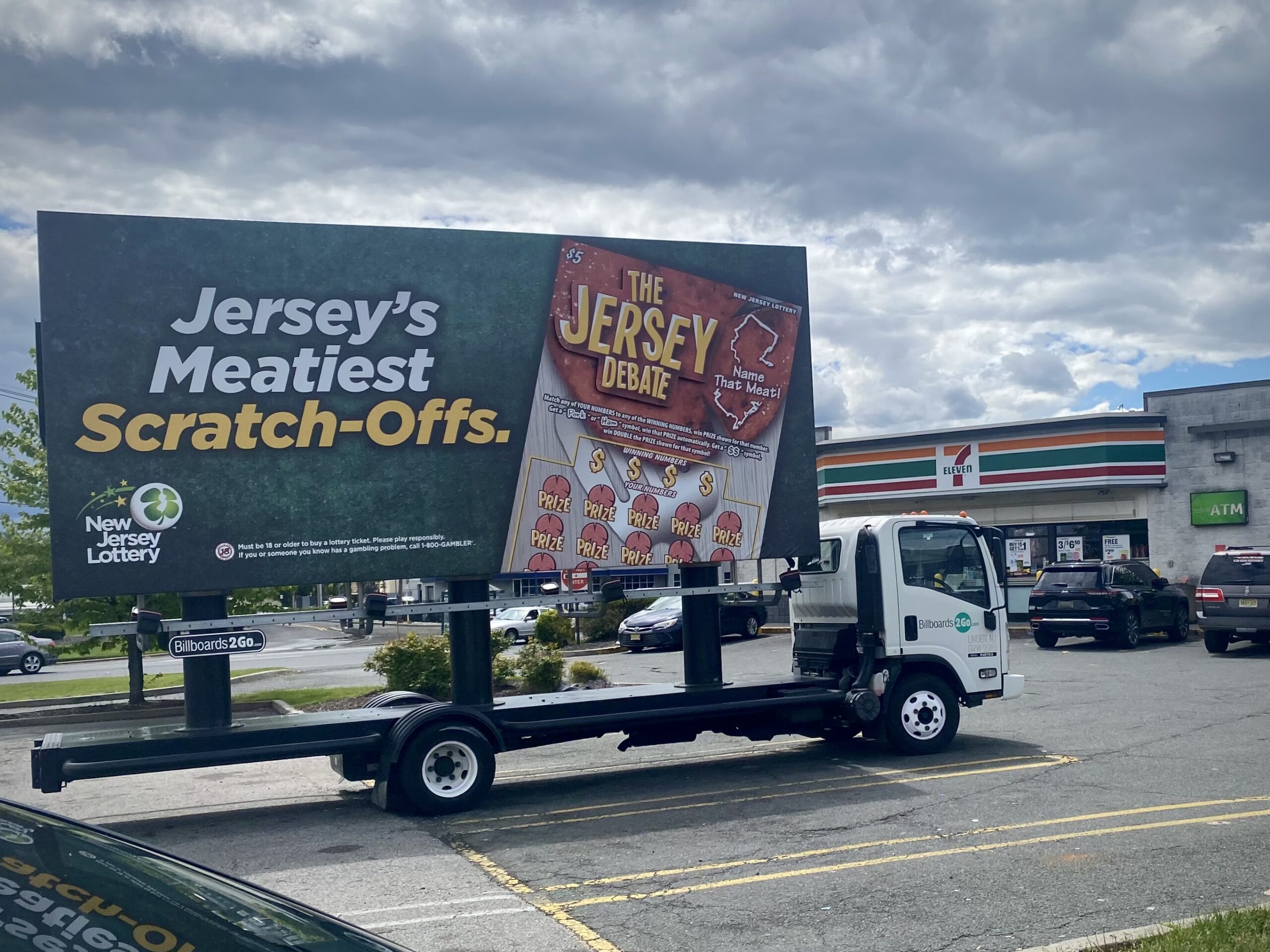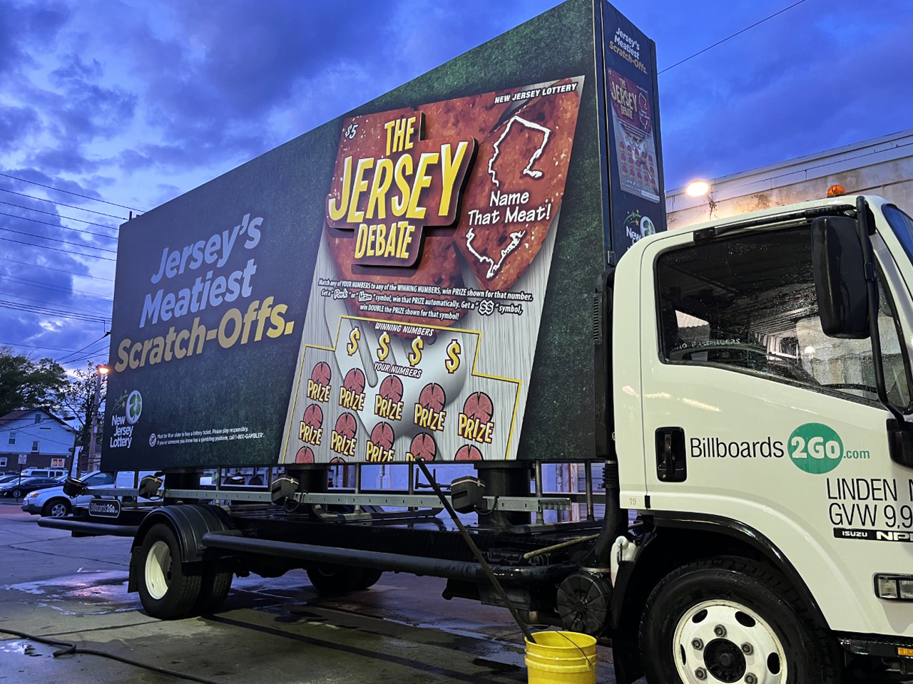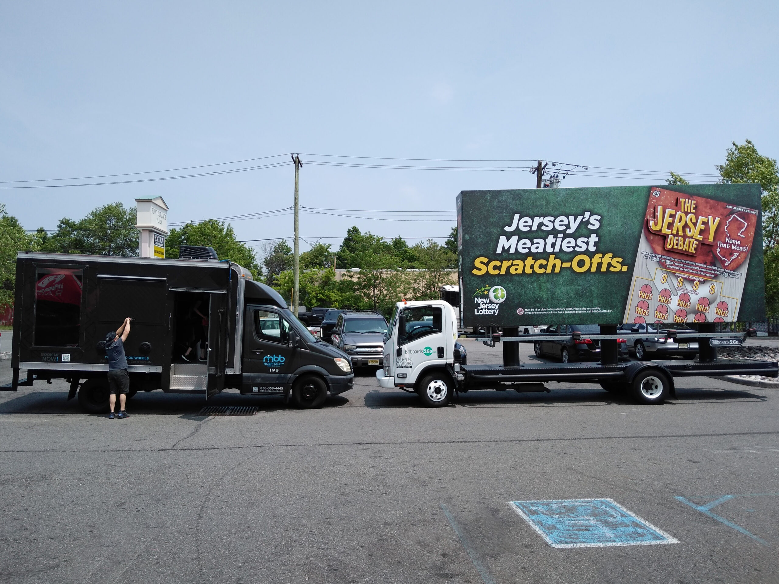 NOTE: 05/24/23 The Ham vs Pork NJ Lottery mobile billboard campaign is running smoothly and on schedule. The photo below is from the North billboard unit, shown side to side with another NJ Lottery promotional vehicle. As you can see with the unit comparison, Billboards2Go is heads above it’s colleagues in the mobile advertising category. Billboards2Go offers approximately 500 square feet of advertising space, the biggest presentation in the industry.