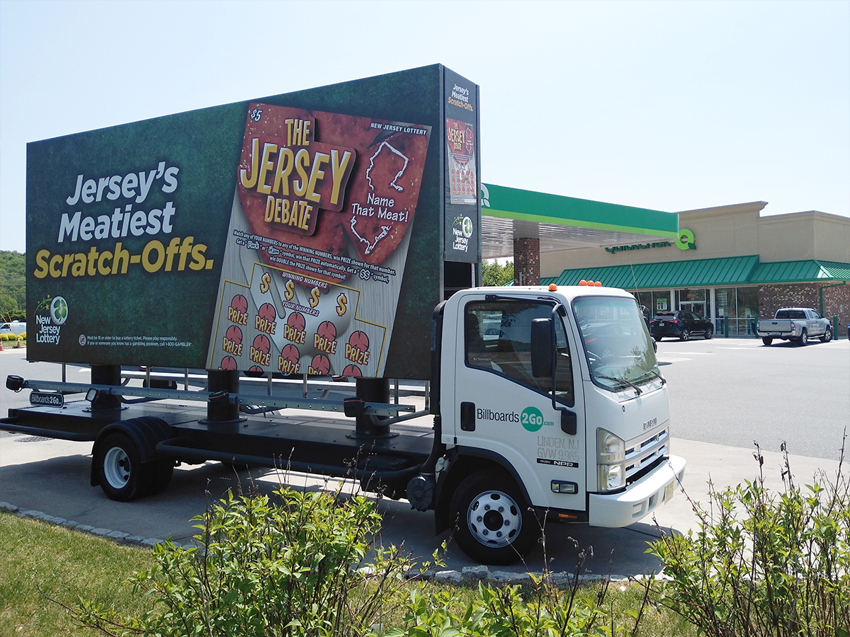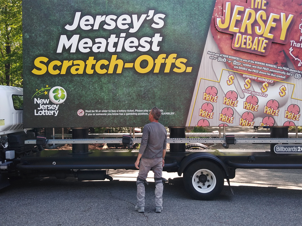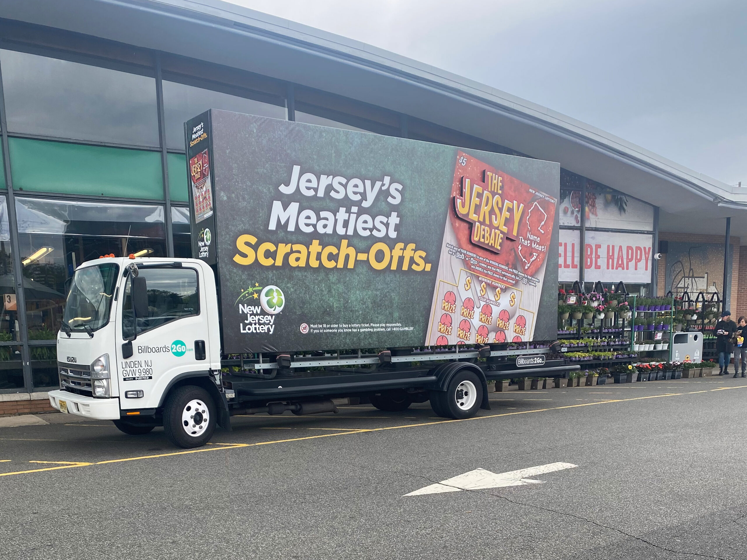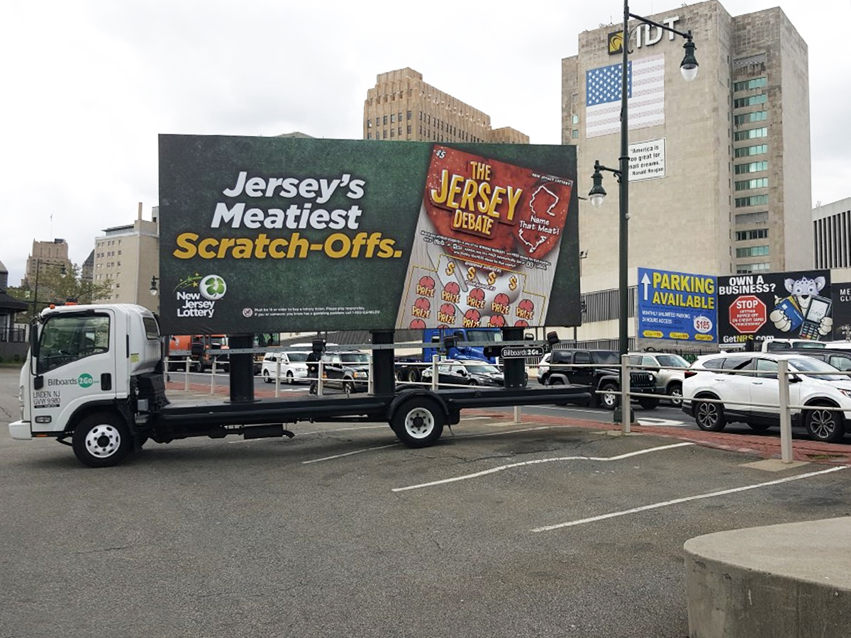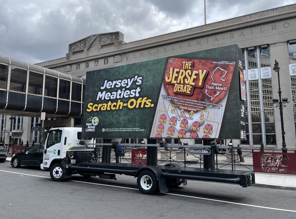 NOTE: 05/24/23 The Ham vs Pork NJ Lottery mobile billboard campaign is running smoothly and on schedule. The photo below is from the North billboard unit, shown side to side with another NJ Lottery promotional vehicle. As you can see with the unit comparison, Billboards2Go is heads above it’s colleagues in the mobile advertising category. Billboards2Go offers approximately 500 square feet of advertising space, the biggest presentation in the industry.