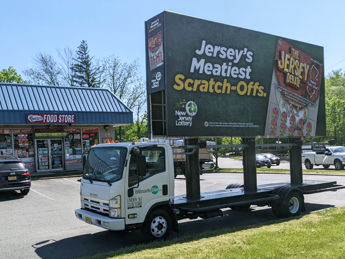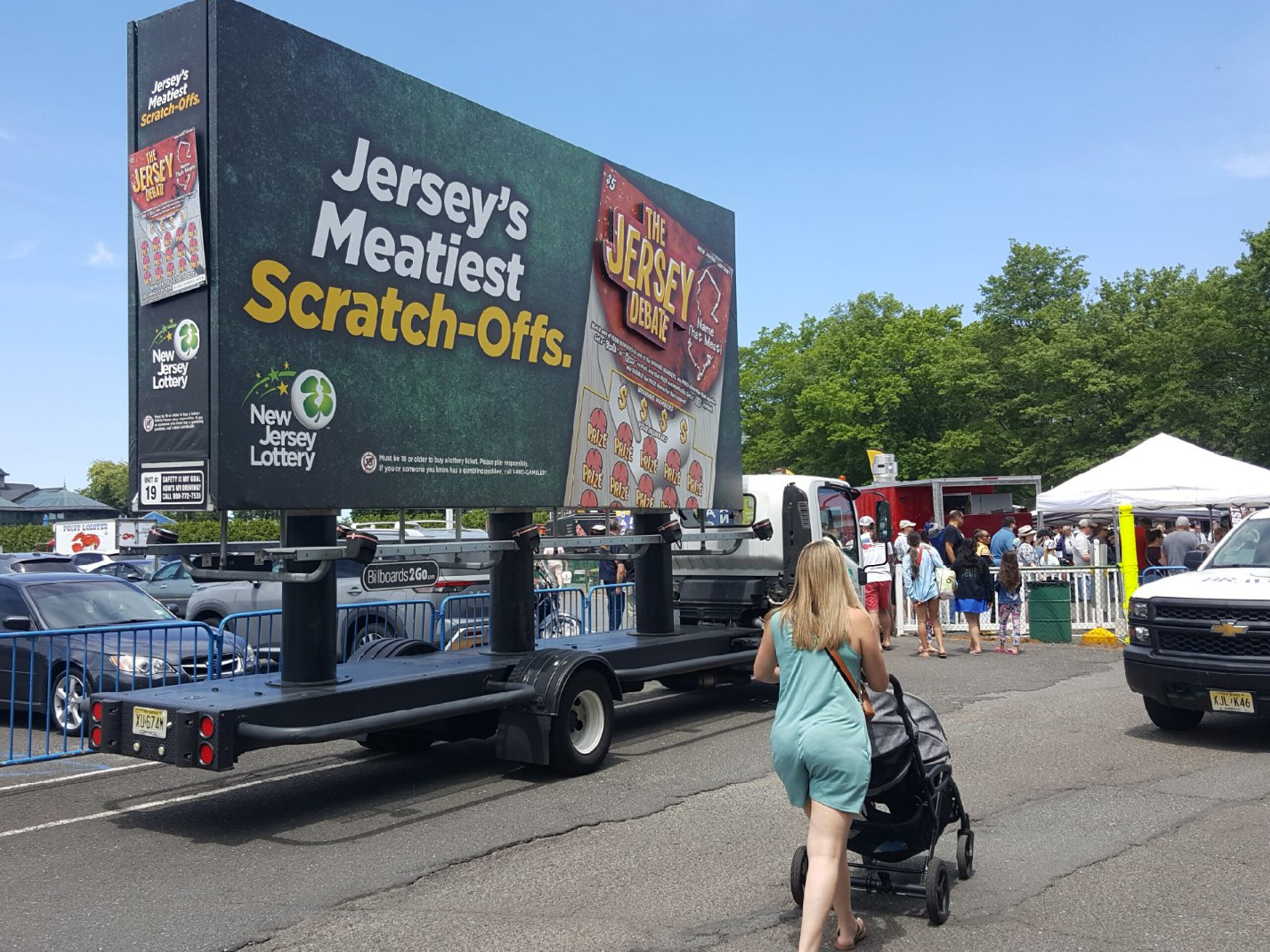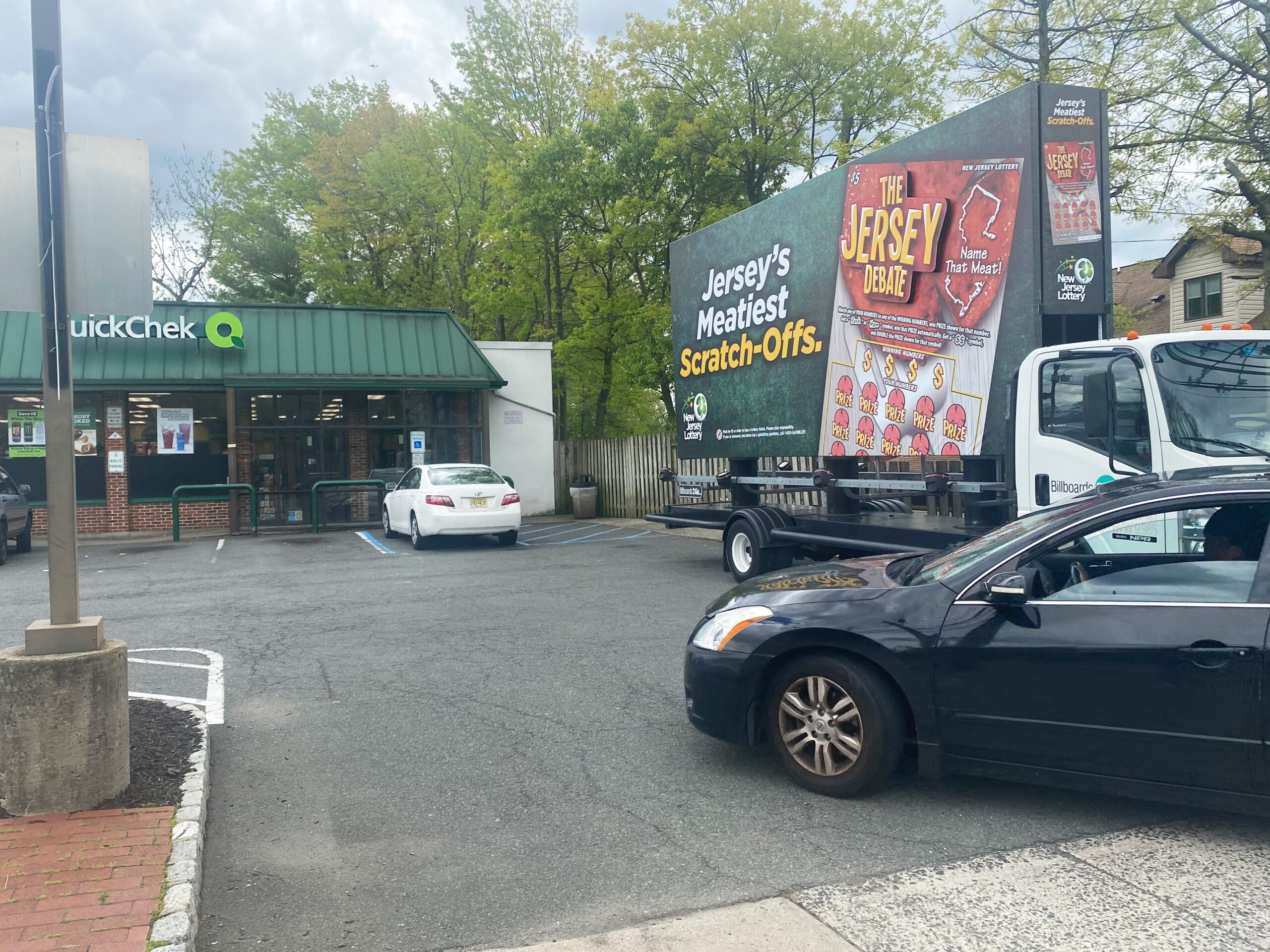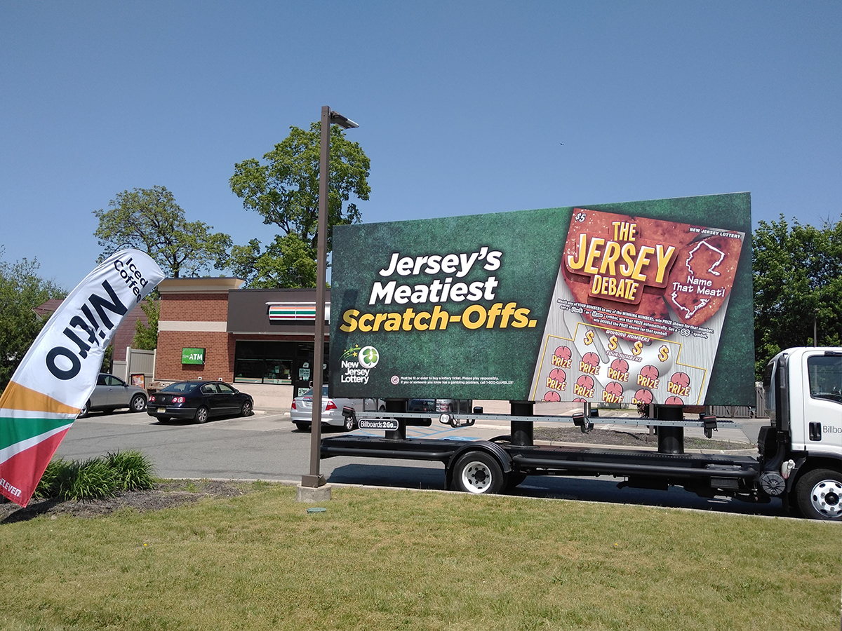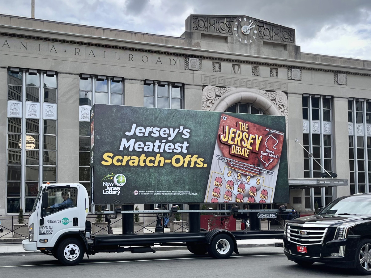 NOTE: 05/24/23 The Ham vs Pork NJ Lottery mobile billboard campaign is running smoothly and on schedule. The photo below is from the North billboard unit, shown side to side with another NJ Lottery promotional vehicle. As you can see with the unit comparison, Billboards2Go is heads above it’s colleagues in the mobile advertising category. Billboards2Go offers approximately 500 square feet of advertising space, the biggest presentation in the industry.
