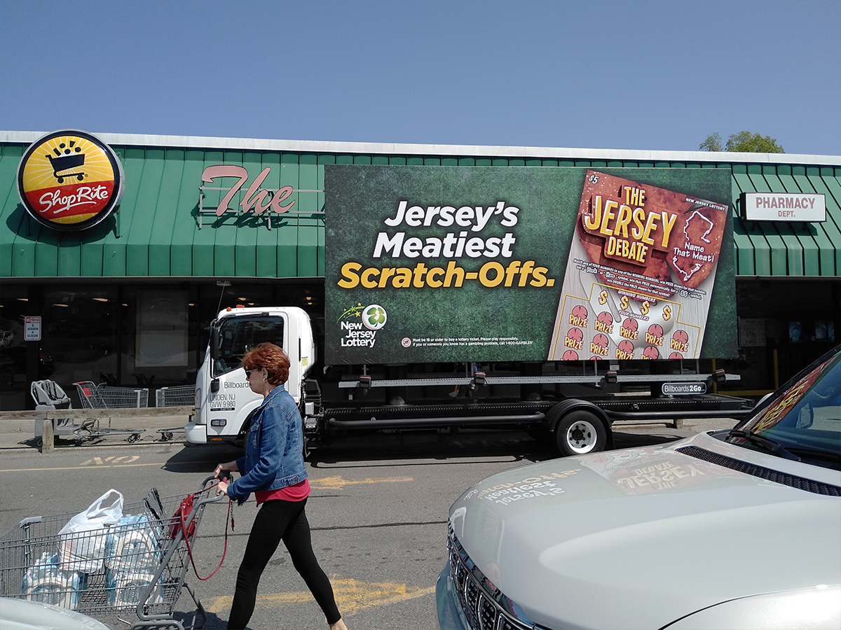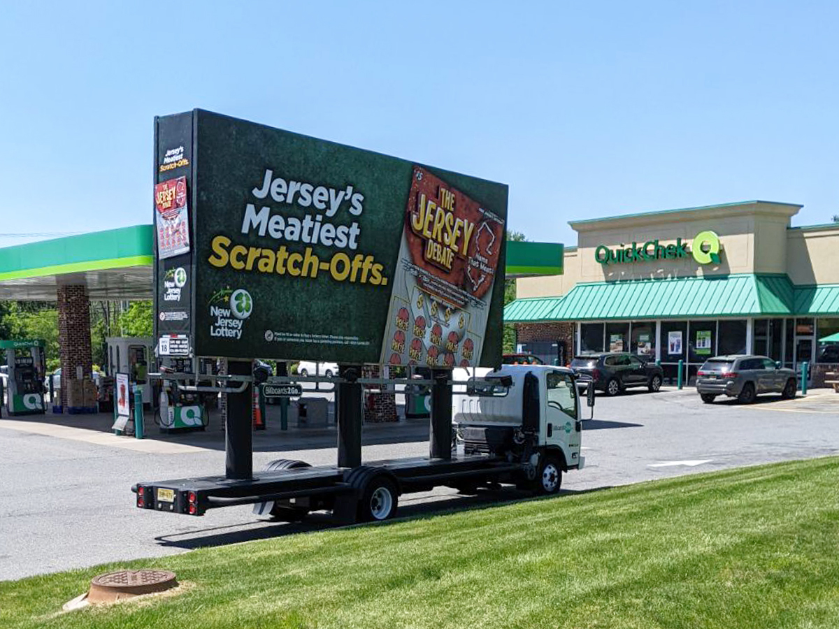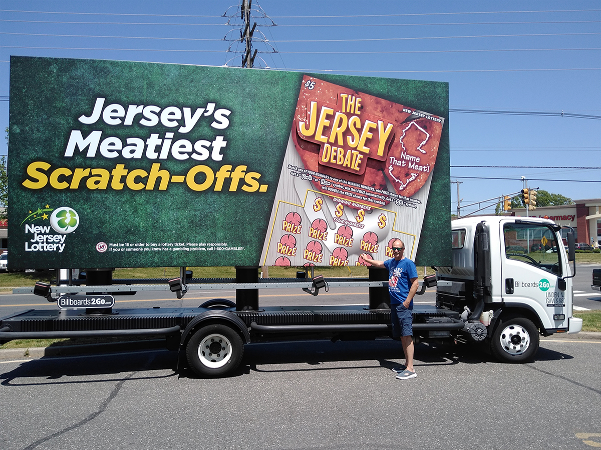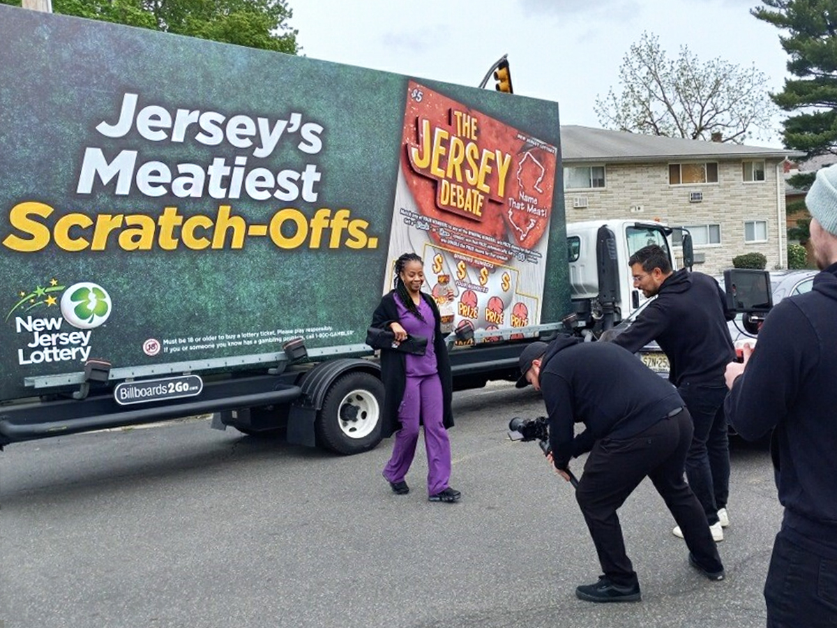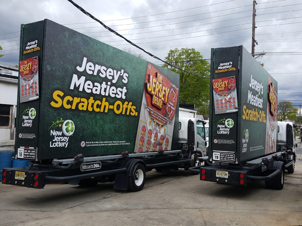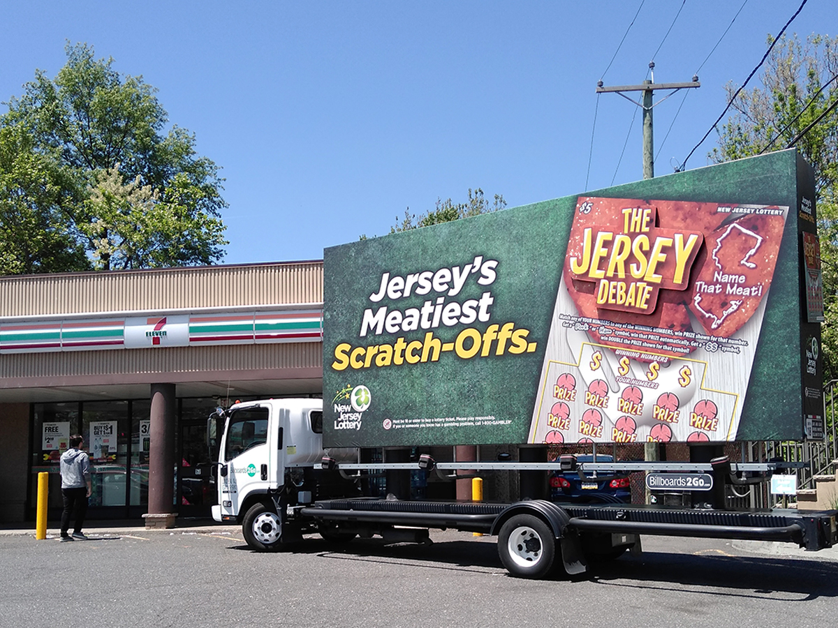 NOTE: 05/24/23 The Ham vs Pork NJ Lottery mobile billboard campaign is running smoothly and on schedule. The photo below is from the North billboard unit, shown side to side with another NJ Lottery promotional vehicle. As you can see with the unit comparison, Billboards2Go is heads above it’s colleagues in the mobile advertising category. Billboards2Go offers approximately 500 square feet of advertising space, the biggest presentation in the industry.
