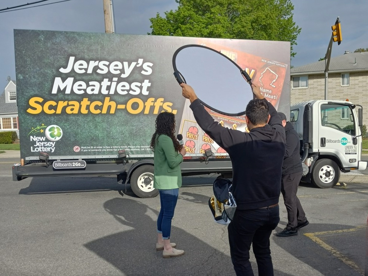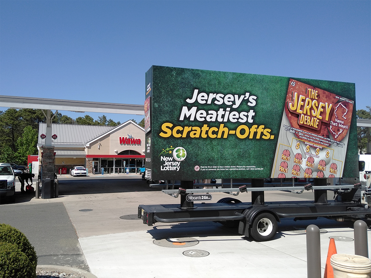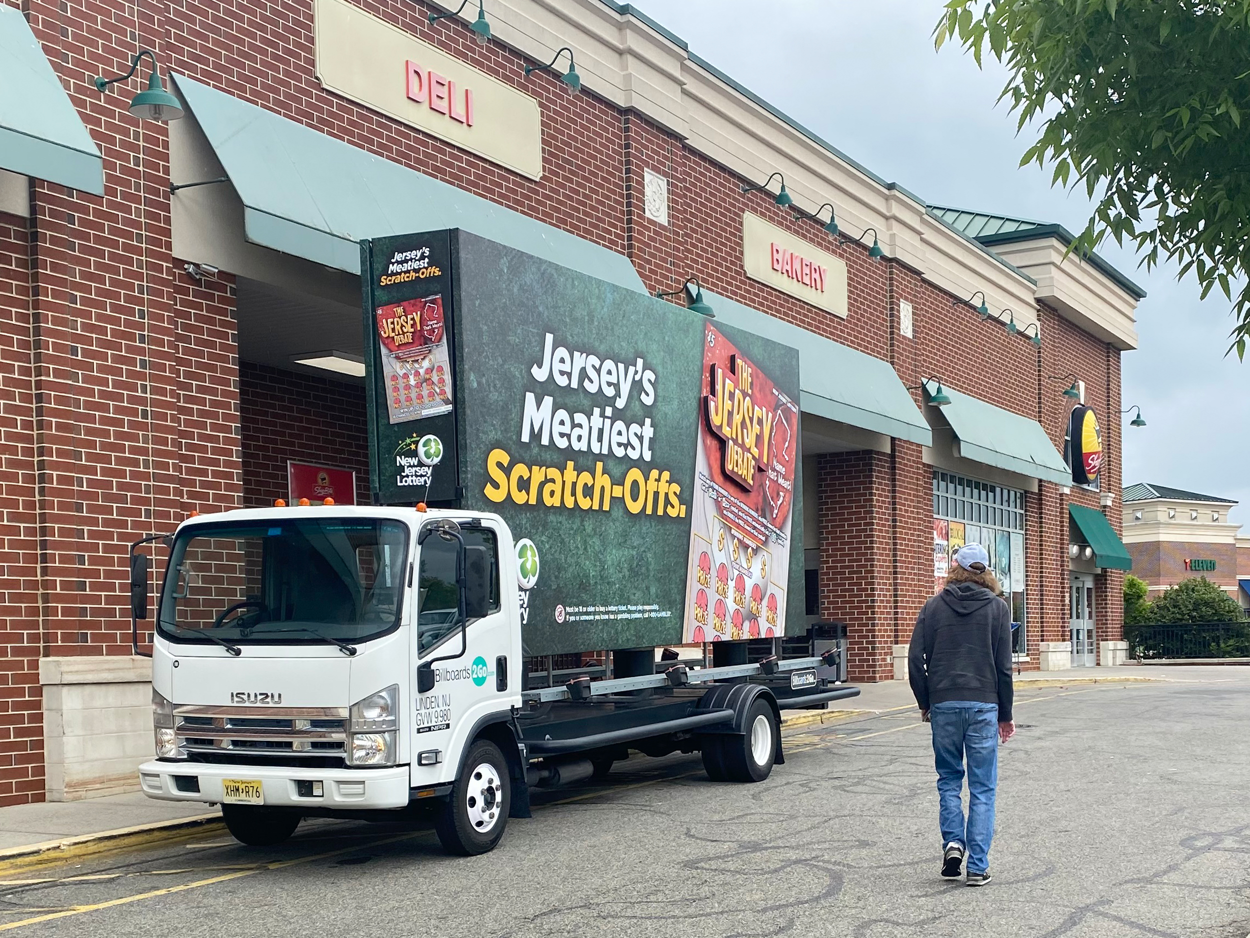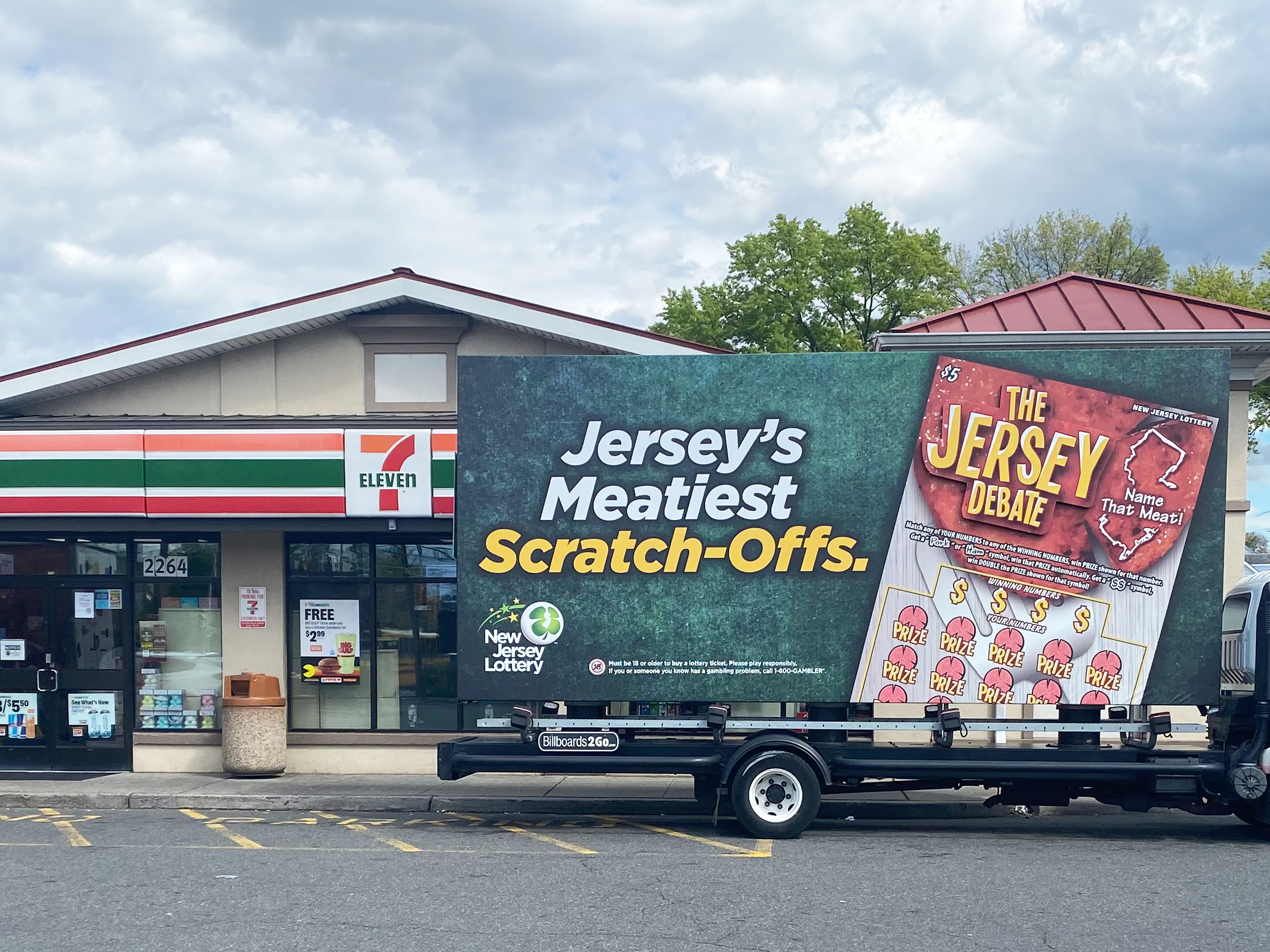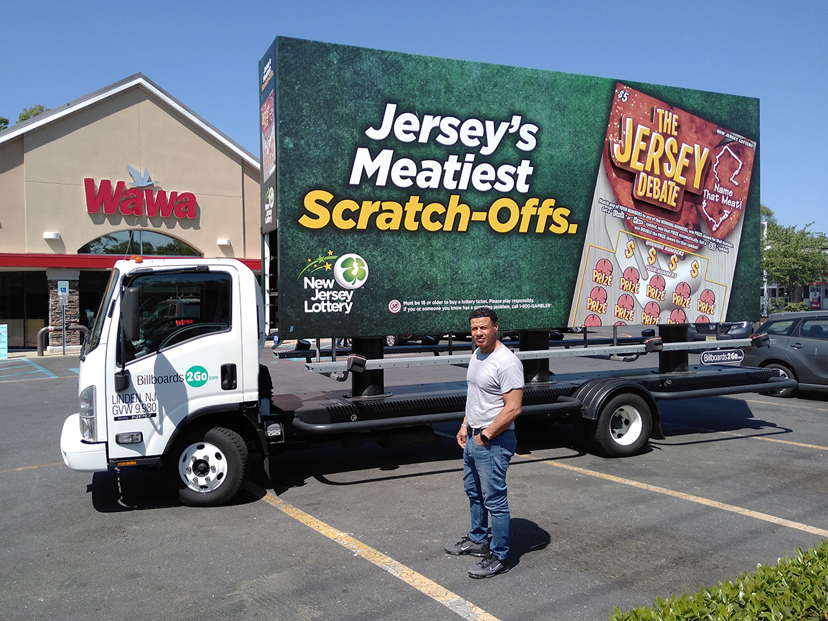 NOTE: 05/24/23 The Ham vs Pork NJ Lottery mobile billboard campaign is running smoothly and on schedule. The photo below is from the North billboard unit, shown side to side with another NJ Lottery promotional vehicle. As you can see with the unit comparison, Billboards2Go is heads above it’s colleagues in the mobile advertising category. Billboards2Go offers approximately 500 square feet of advertising space, the biggest presentation in the industry.
