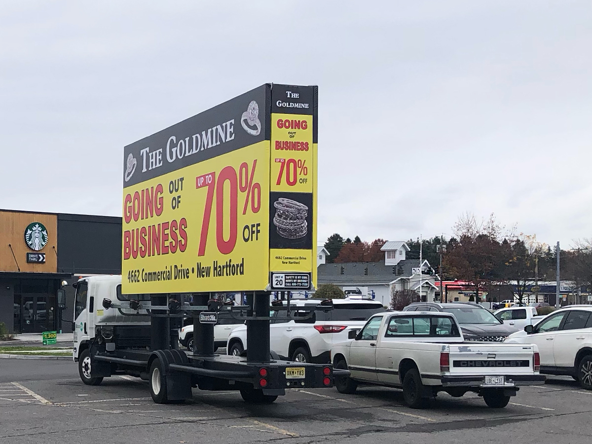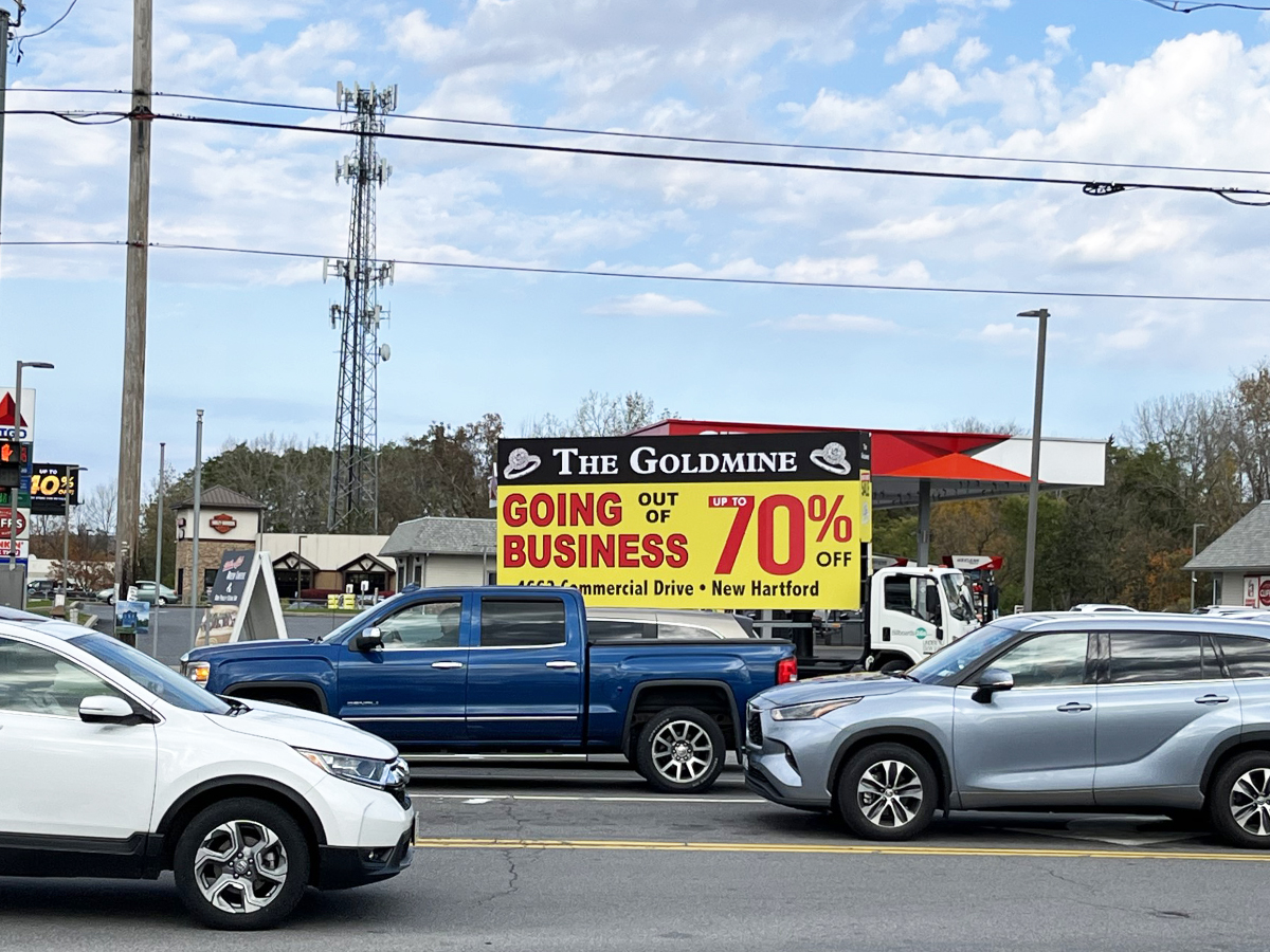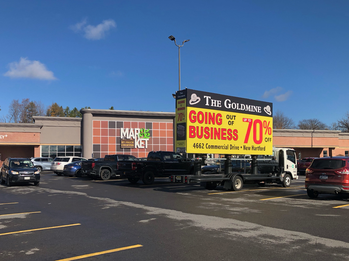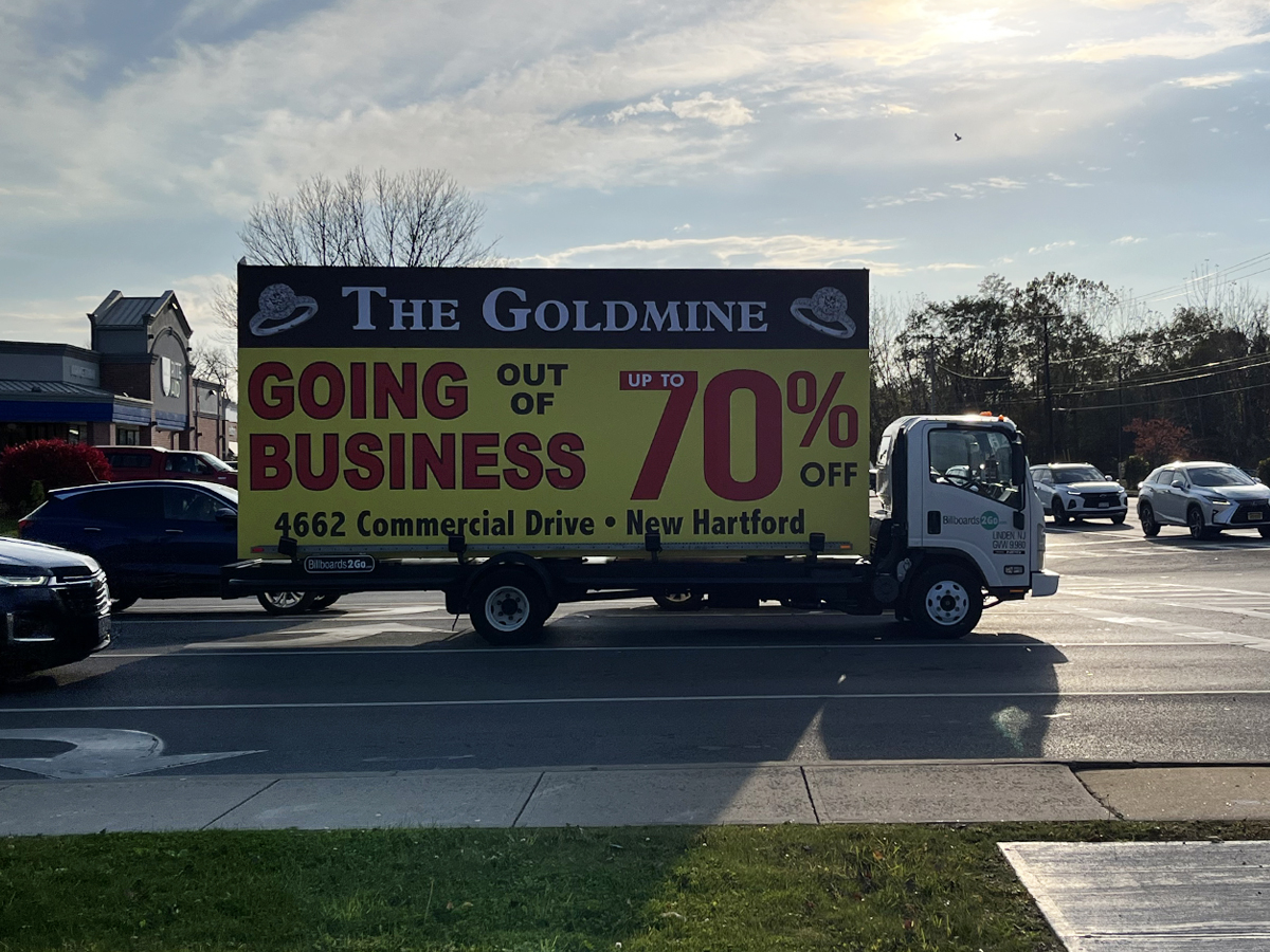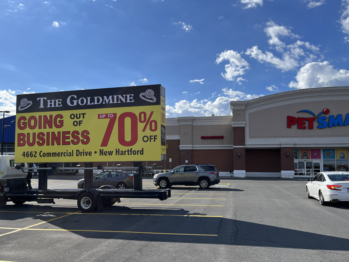 NOTE: 10/19/23 The image provided below is for illustrative purpose only to show the client’s store within the New Hartford, NY strip mall. We want to let you know that Billboards 2Go is on track to launch the campaign next Tuesday morning. Currently, there are no photos available of the billboard unit with the ad banners. The banners will be posted at the local parking facility in Marcy over the upcoming weekend. The drivers of this campaign are from the local area and they know the roads very well. They will strive to gain exceptional exposure for Goldmine. Additionally, we are planning to have the drivers stop by the strip mall’s entrance for local targeted exposure periodically during the day.