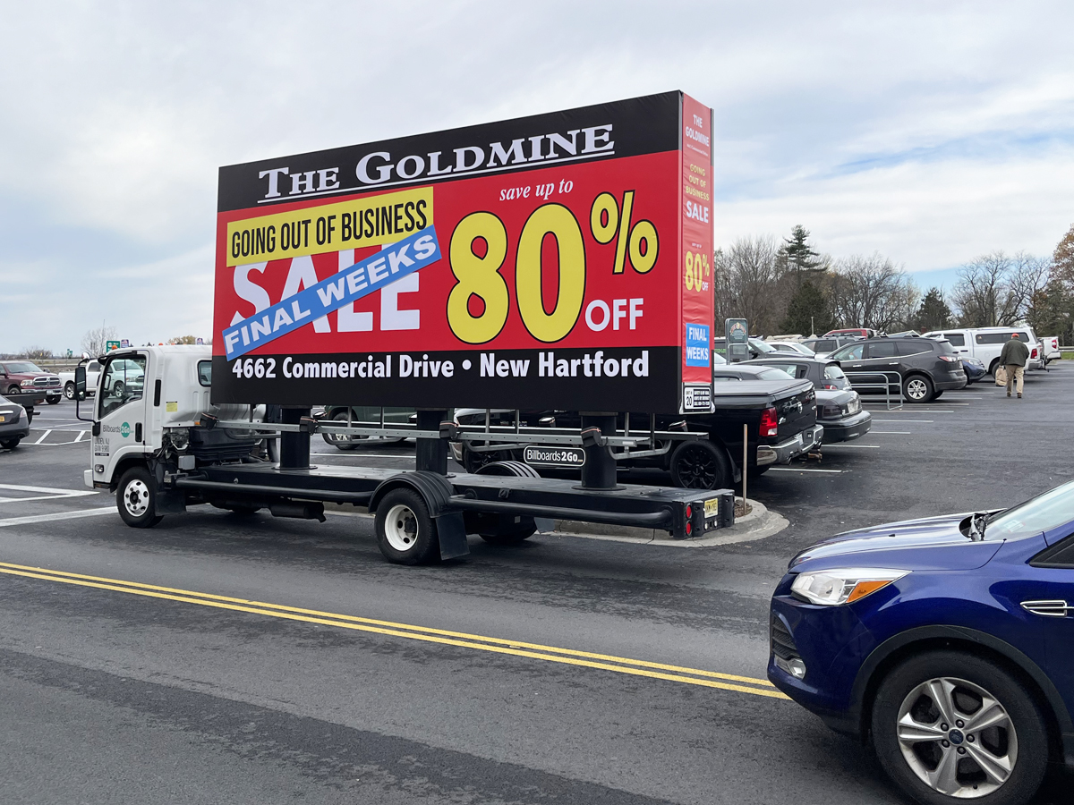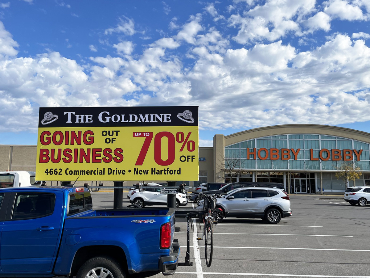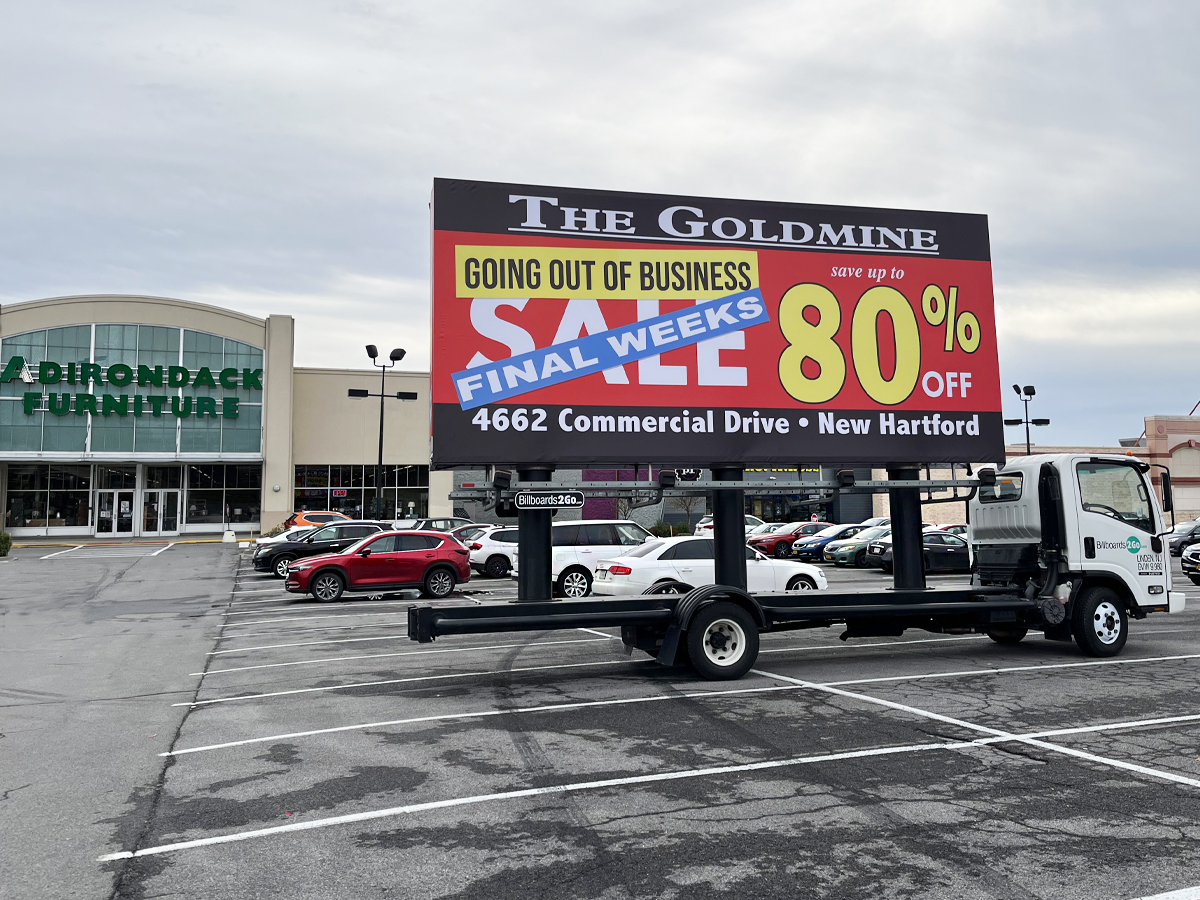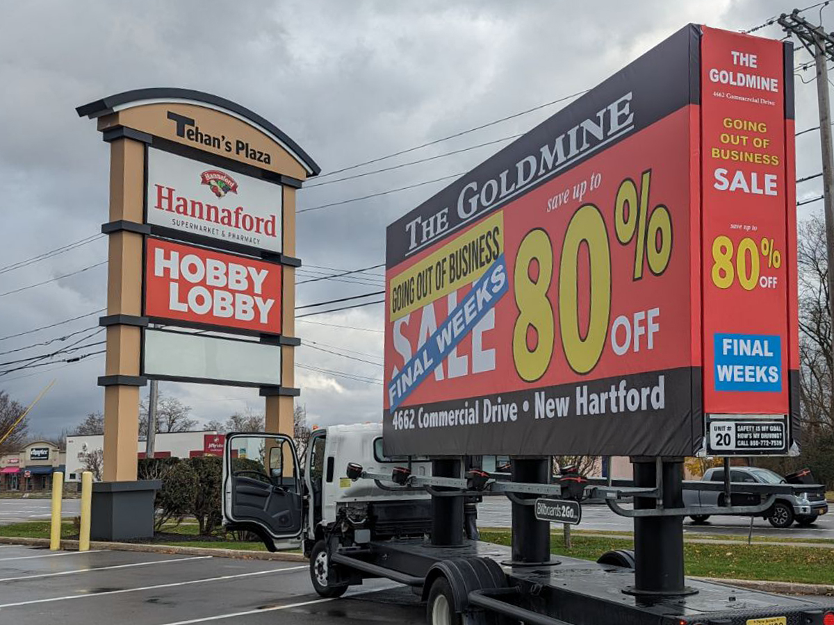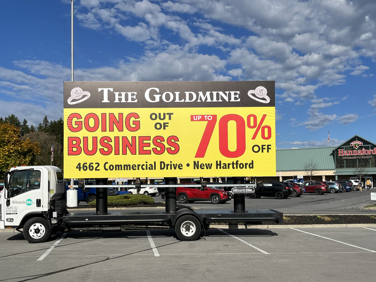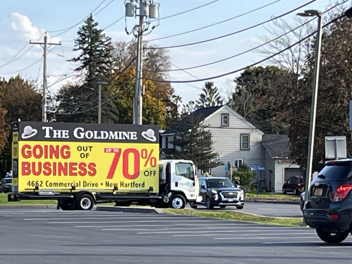 NOTE: 10/19/23 The image provided below is for illustrative purpose only to show the client’s store within the New Hartford, NY strip mall. We want to let you know that Billboards 2Go is on track to launch the campaign next Tuesday morning. Currently, there are no photos available of the billboard unit with the ad banners. The banners will be posted at the local parking facility in Marcy over the upcoming weekend. The drivers of this campaign are from the local area and they know the roads very well. They will strive to gain exceptional exposure for Goldmine. Additionally, we are planning to have the drivers stop by the strip mall’s entrance for local targeted exposure periodically during the day.