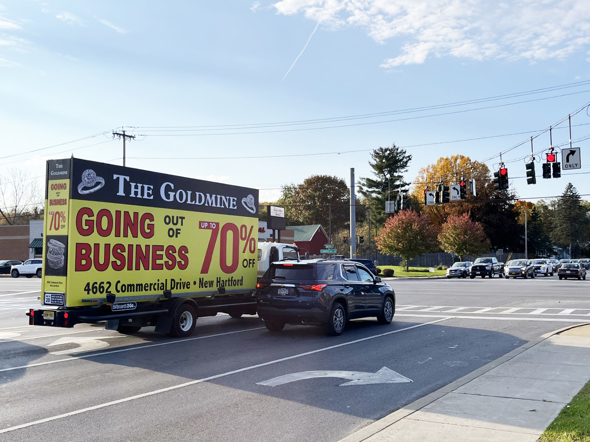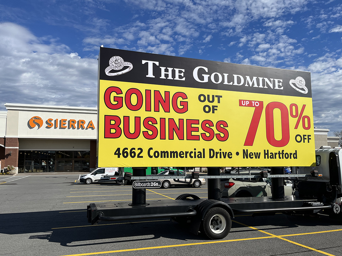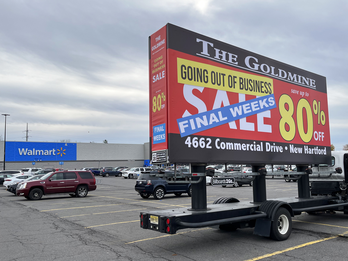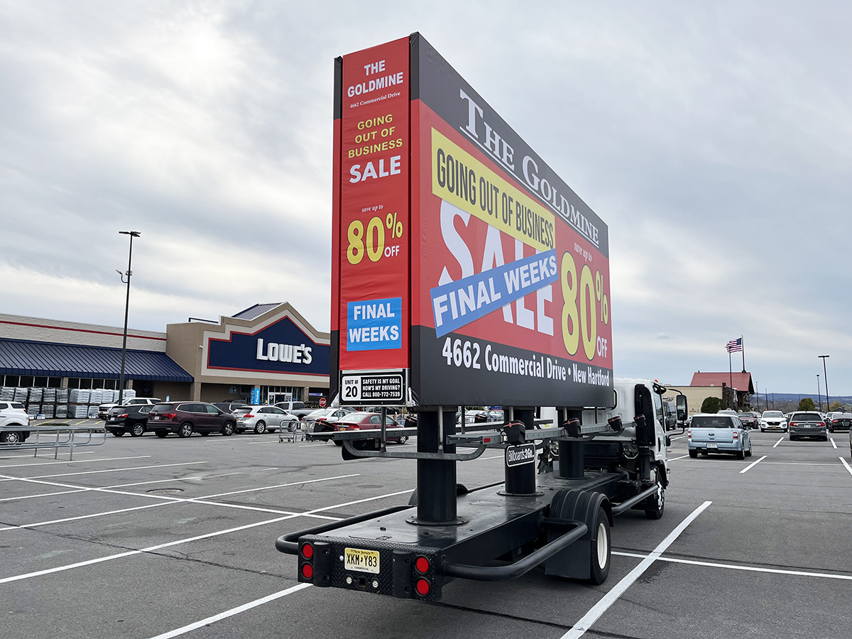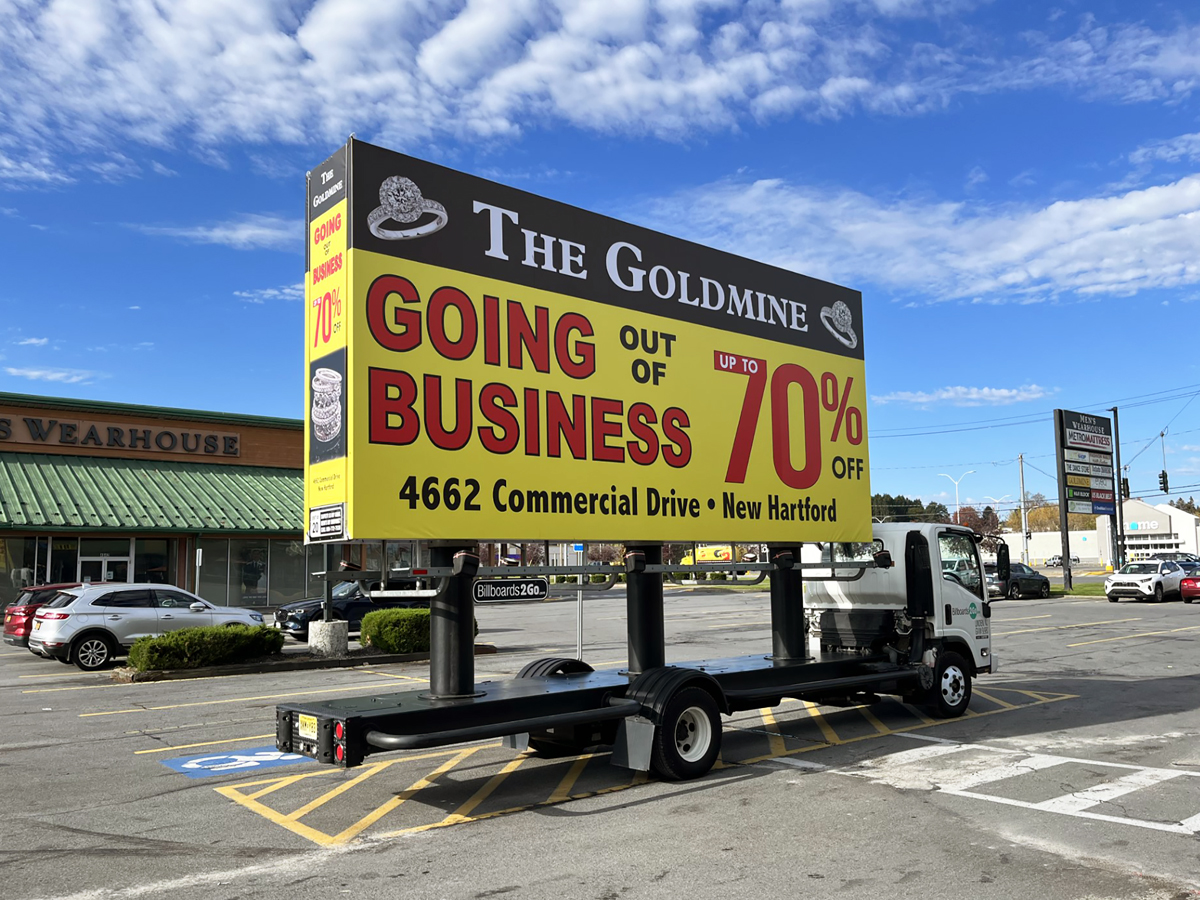 NOTE: 10/19/23 The image provided below is for illustrative purpose only to show the client’s store within the New Hartford, NY strip mall. We want to let you know that Billboards 2Go is on track to launch the campaign next Tuesday morning. Currently, there are no photos available of the billboard unit with the ad banners. The banners will be posted at the local parking facility in Marcy over the upcoming weekend. The drivers of this campaign are from the local area and they know the roads very well. They will strive to gain exceptional exposure for Goldmine. Additionally, we are planning to have the drivers stop by the strip mall’s entrance for local targeted exposure periodically during the day.