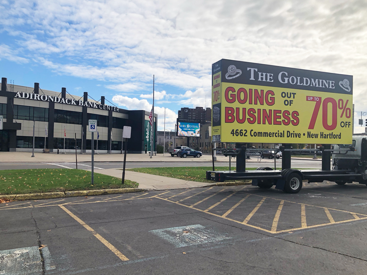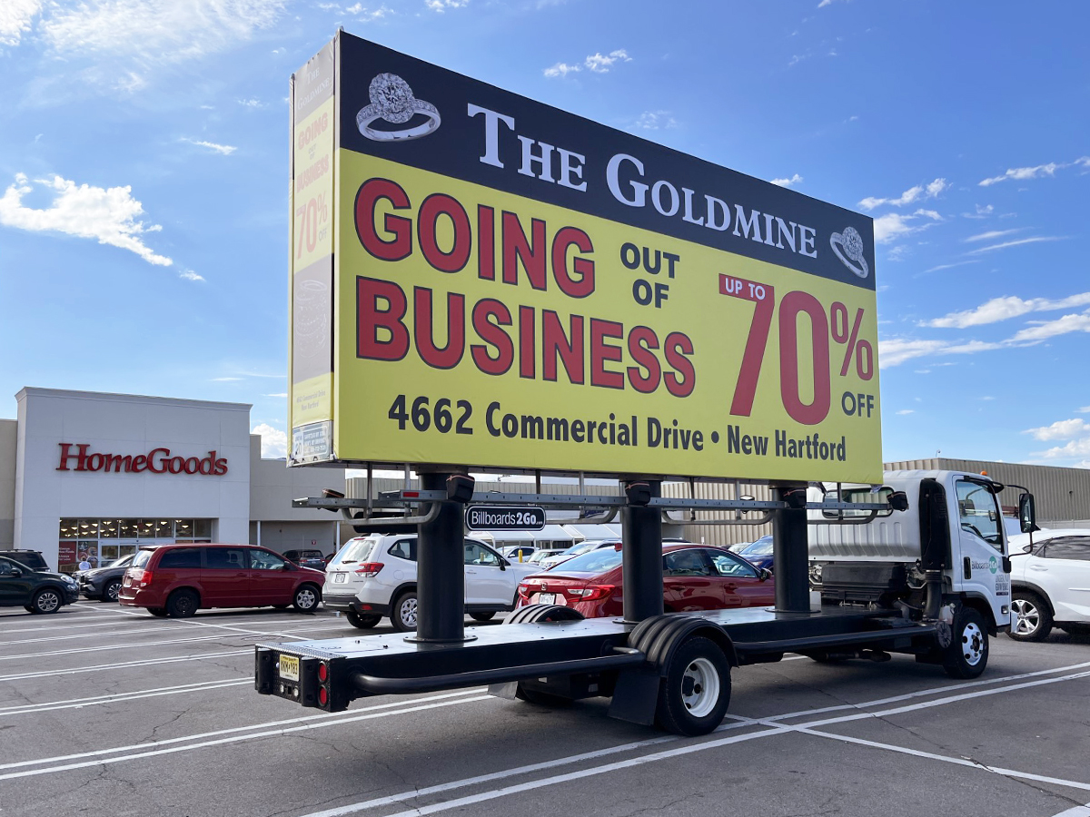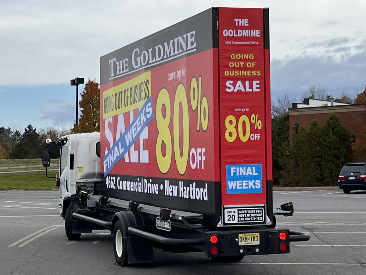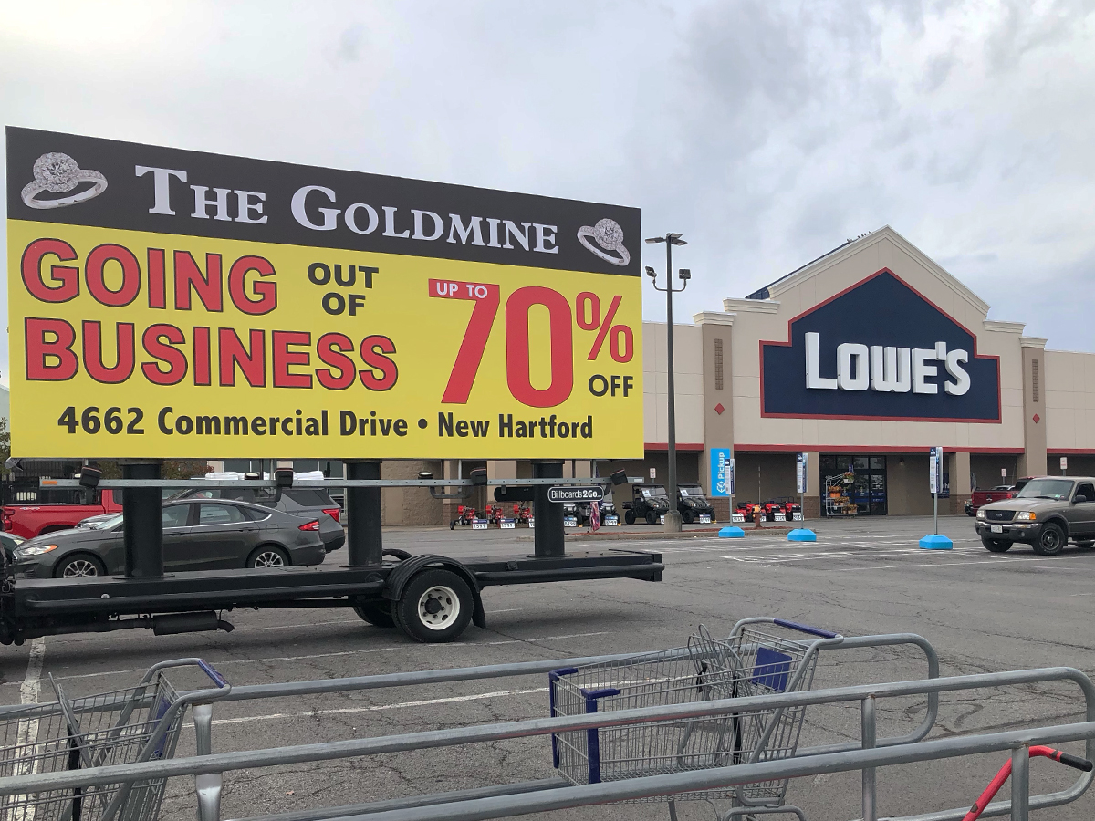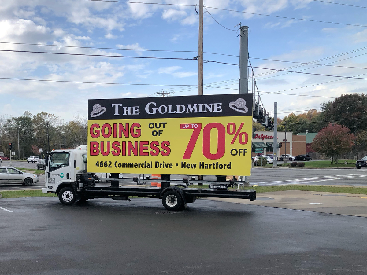 NOTE: 10/19/23 The image provided below is for illustrative purpose only to show the client’s store within the New Hartford, NY strip mall. We want to let you know that Billboards 2Go is on track to launch the campaign next Tuesday morning. Currently, there are no photos available of the billboard unit with the ad banners. The banners will be posted at the local parking facility in Marcy over the upcoming weekend. The drivers of this campaign are from the local area and they know the roads very well. They will strive to gain exceptional exposure for Goldmine. Additionally, we are planning to have the drivers stop by the strip mall’s entrance for local targeted exposure periodically during the day.