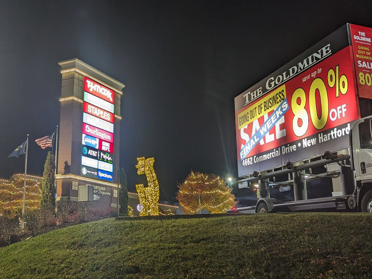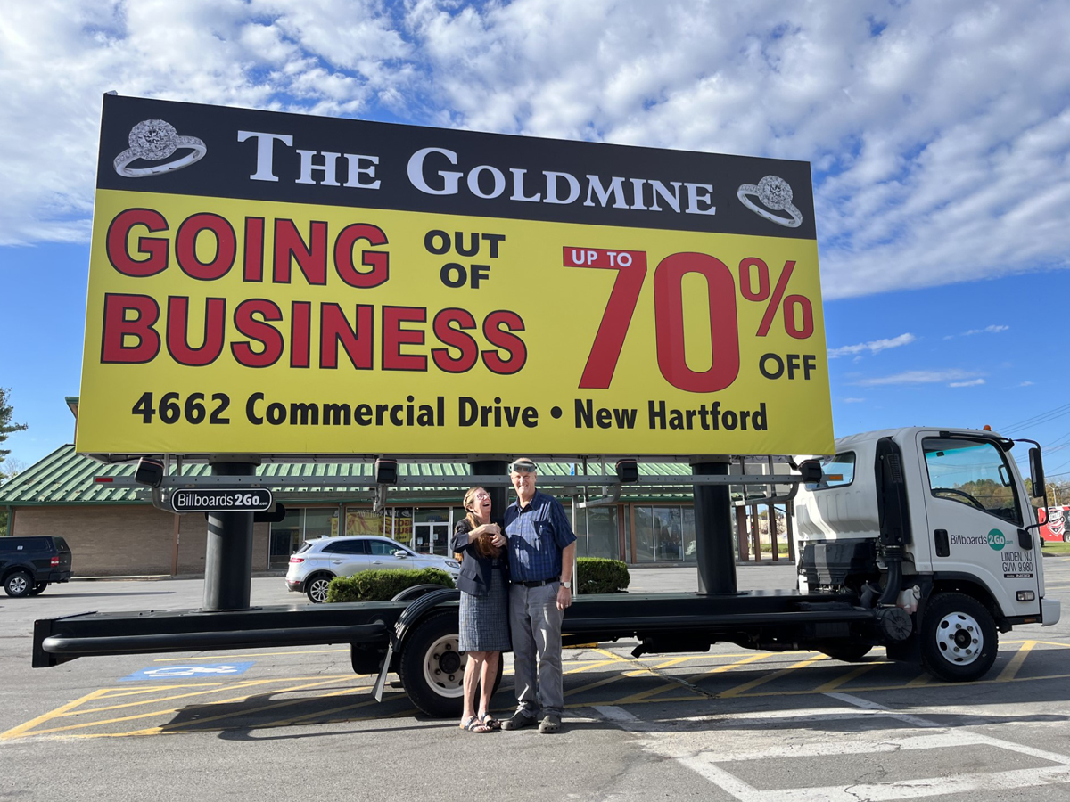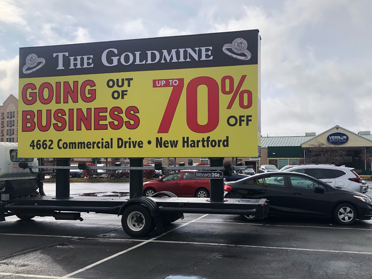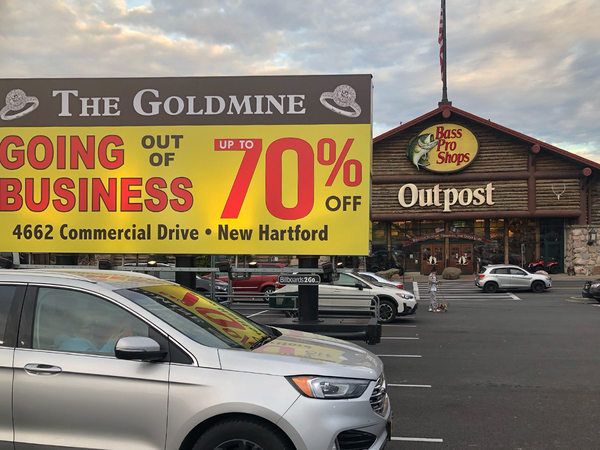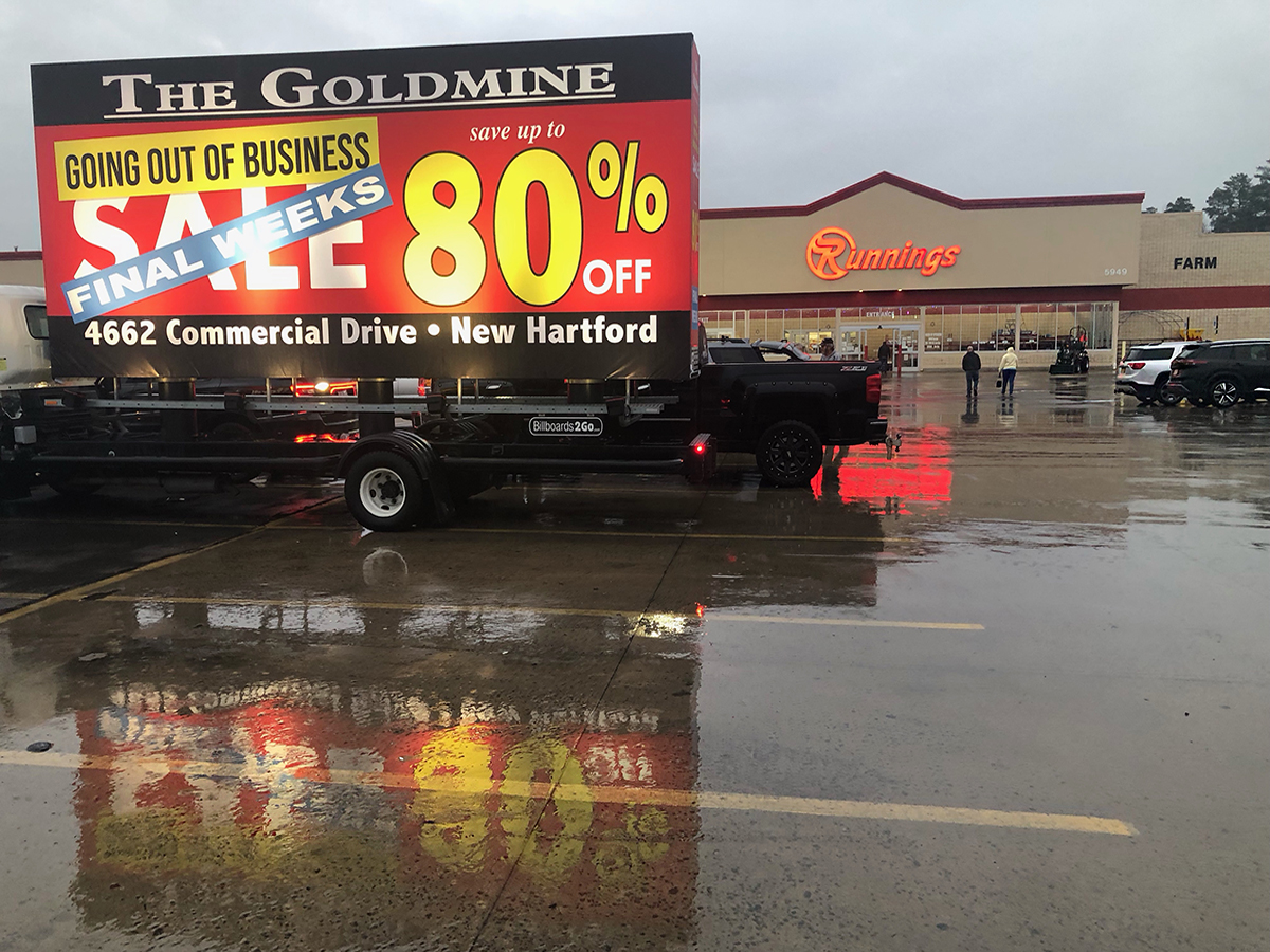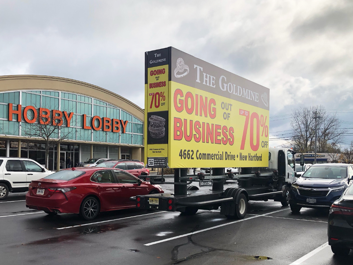 NOTE: 10/19/23 The image provided below is for illustrative purpose only to show the client’s store within the New Hartford, NY strip mall. We want to let you know that Billboards 2Go is on track to launch the campaign next Tuesday morning. Currently, there are no photos available of the billboard unit with the ad banners. The banners will be posted at the local parking facility in Marcy over the upcoming weekend. The drivers of this campaign are from the local area and they know the roads very well. They will strive to gain exceptional exposure for Goldmine. Additionally, we are planning to have the drivers stop by the strip mall’s entrance for local targeted exposure periodically during the day.