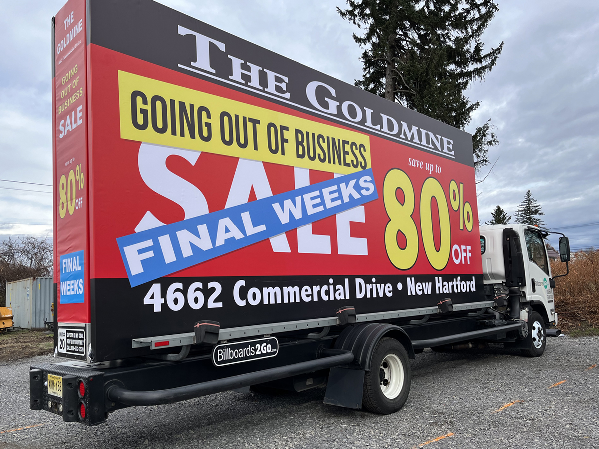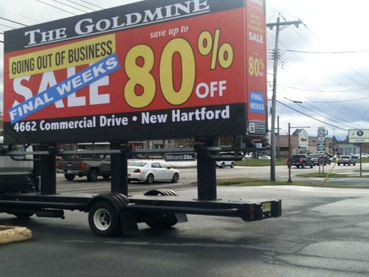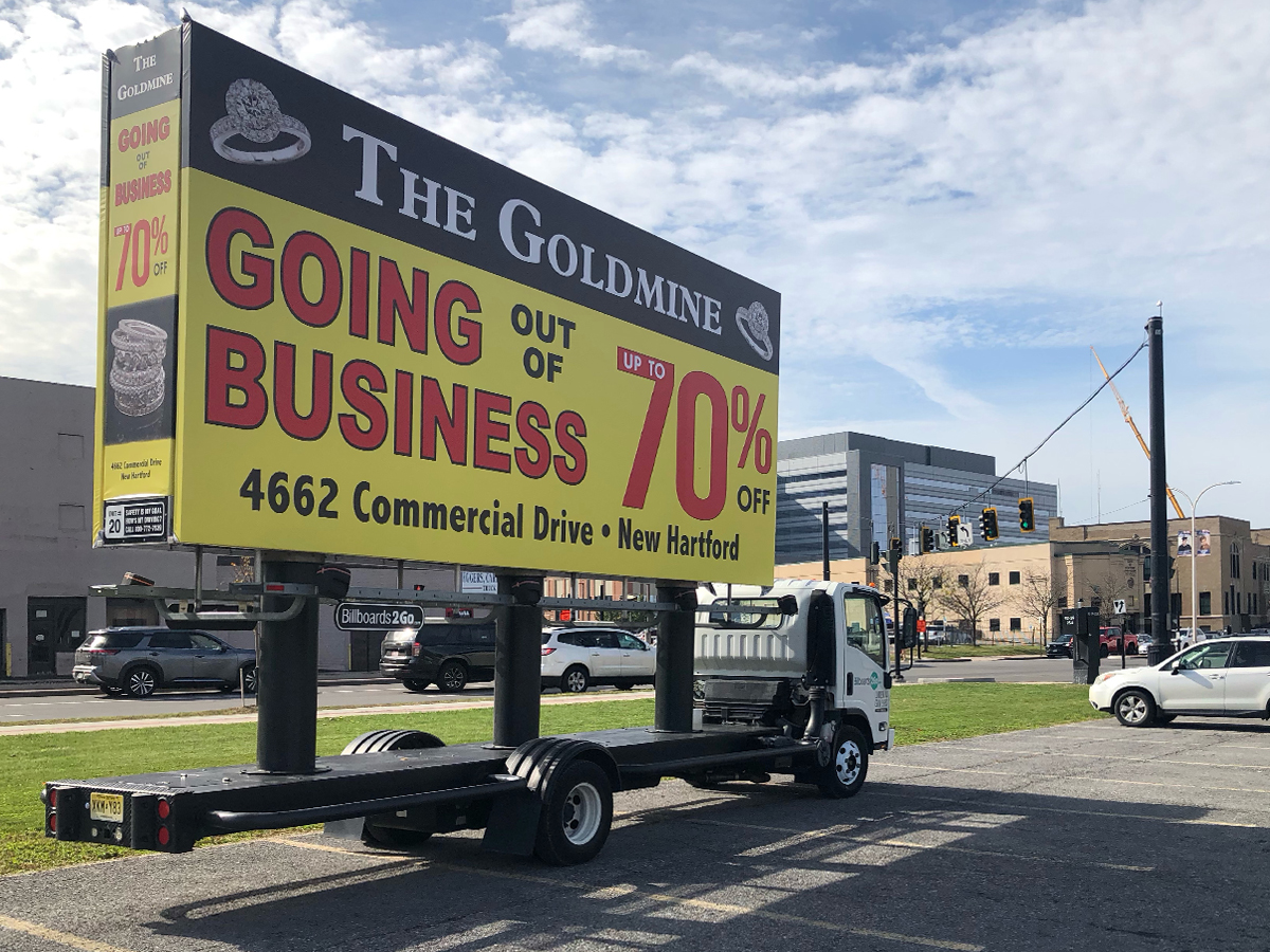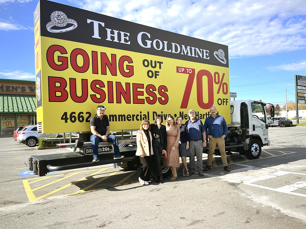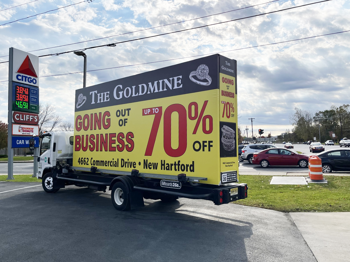 NOTE: 10/19/23 The image provided below is for illustrative purpose only to show the client’s store within the New Hartford, NY strip mall. We want to let you know that Billboards 2Go is on track to launch the campaign next Tuesday morning. Currently, there are no photos available of the billboard unit with the ad banners. The banners will be posted at the local parking facility in Marcy over the upcoming weekend. The drivers of this campaign are from the local area and they know the roads very well. They will strive to gain exceptional exposure for Goldmine. Additionally, we are planning to have the drivers stop by the strip mall’s entrance for local targeted exposure periodically during the day.