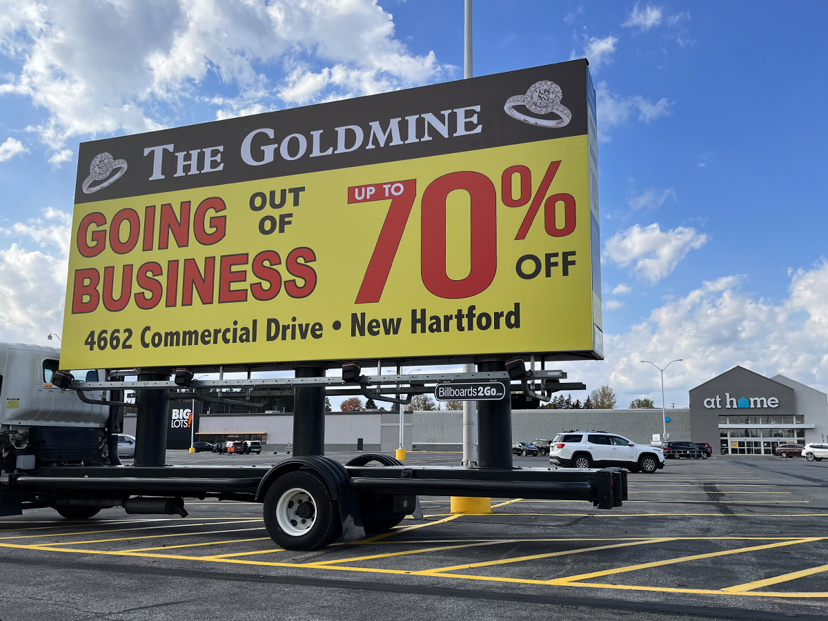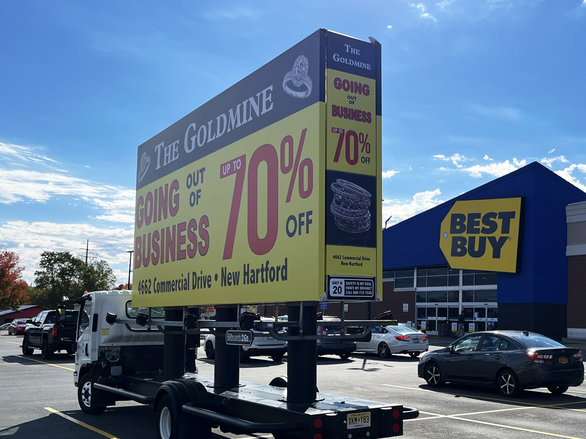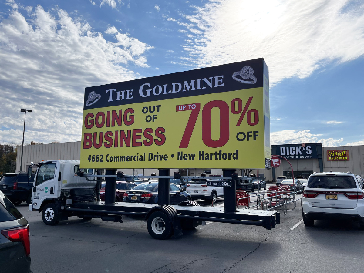 NOTE: 11/10/23 The Goldmine 80% Off billboard launched on schedule this morning. Check out some initial photos below, with more to come tomorrow. Feedback from driver who stopped at the client’s jewelry store earlier today and spoke with the owners has been overwhelmingly positive. They expressed their admiration for the new ad, particularly noting that the red color “really stands out!”