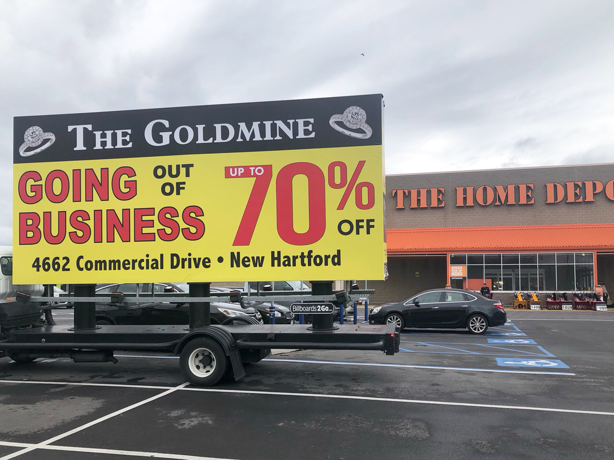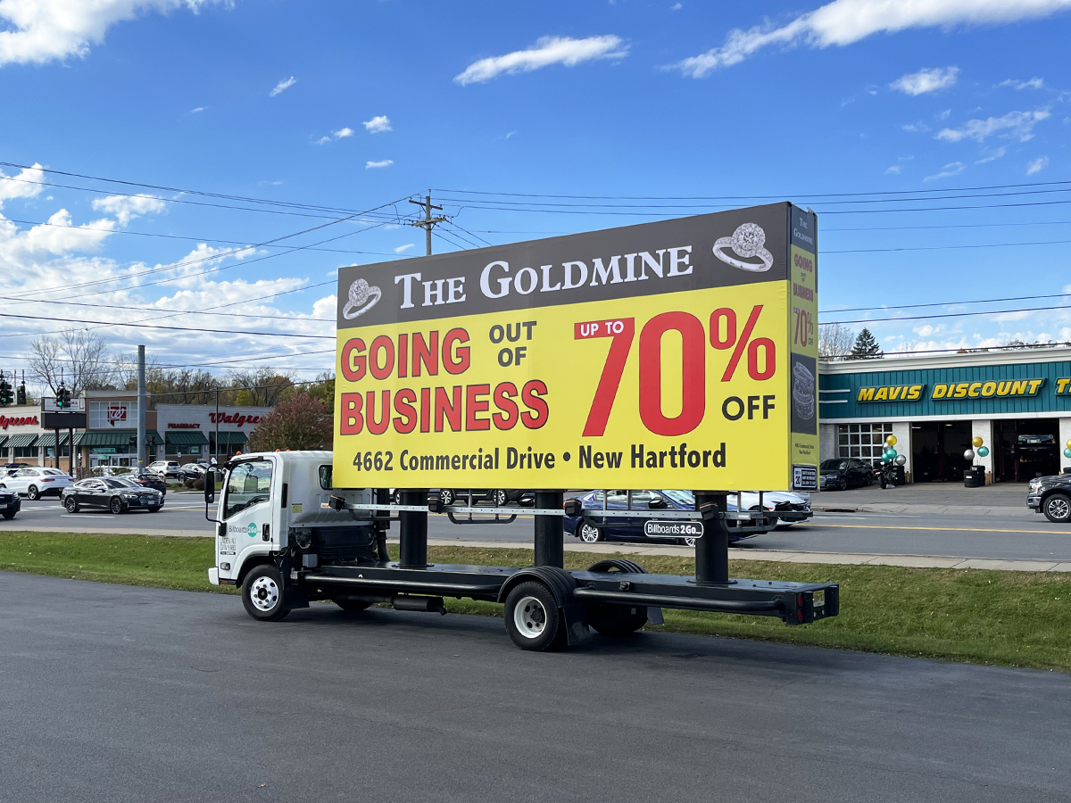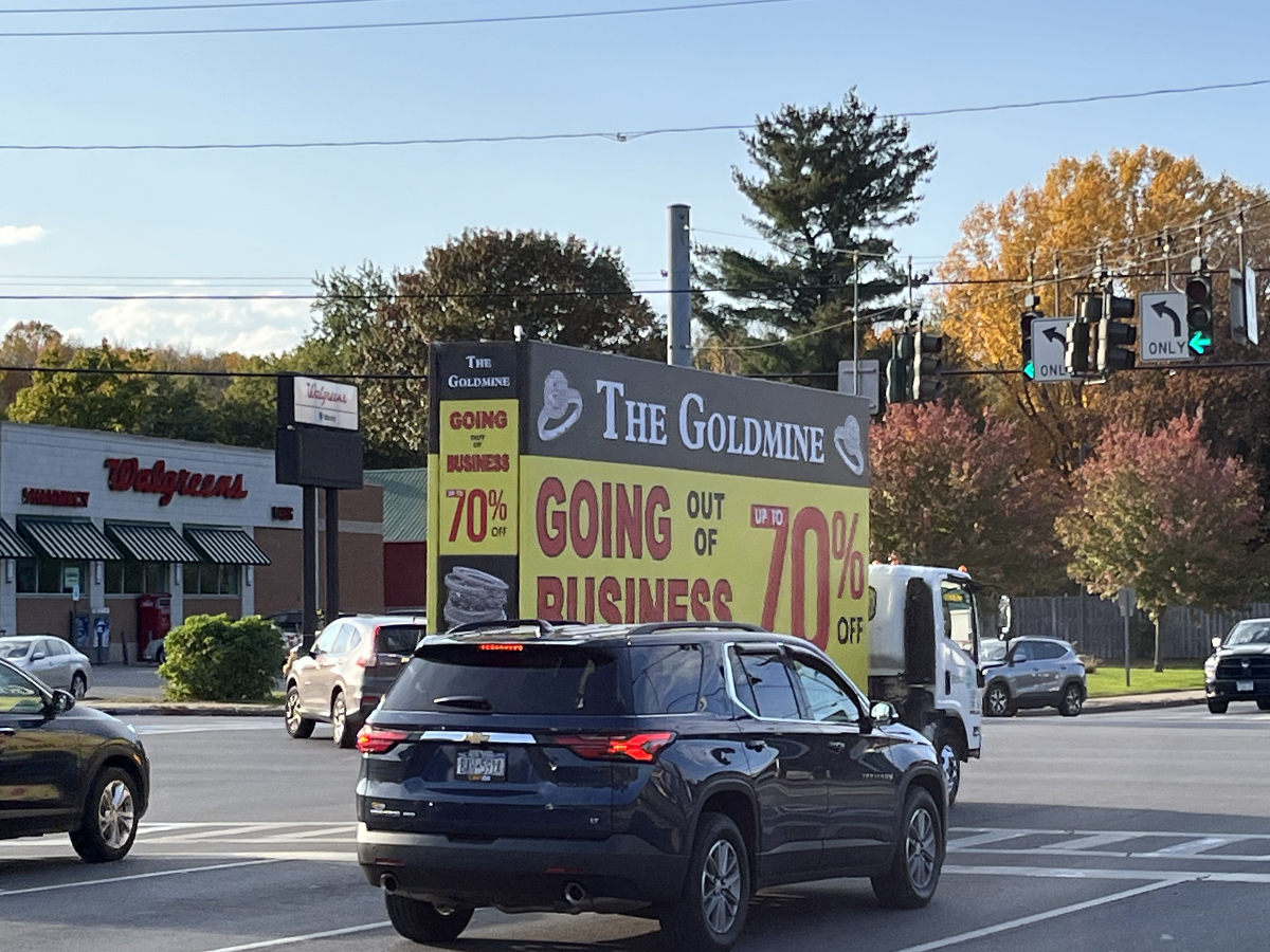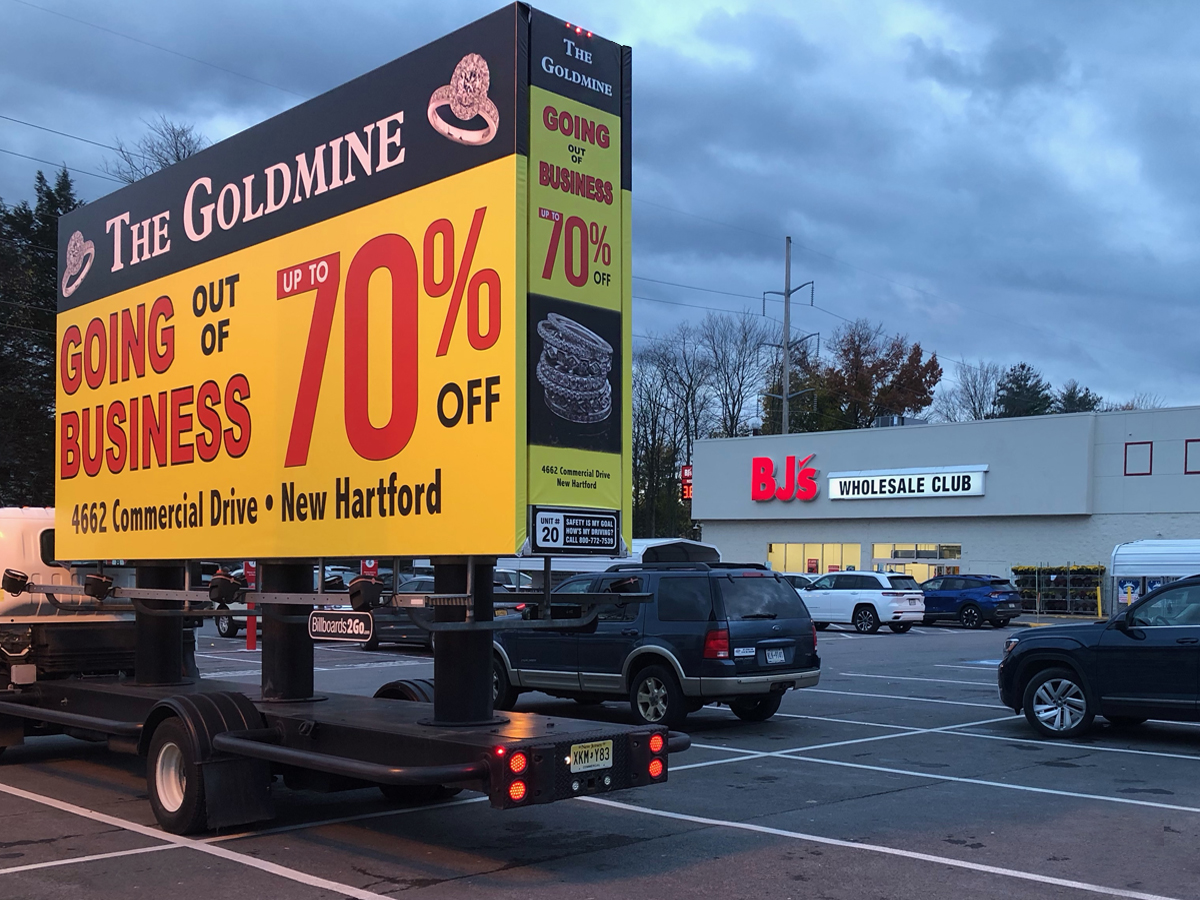 NOTE: 11/10/23 The Goldmine 80% Off billboard launched on schedule this morning. Check out some initial photos below, with more to come tomorrow. Feedback from driver who stopped at the client’s jewelry store earlier today and spoke with the owners has been overwhelmingly positive. They expressed their admiration for the new ad, particularly noting that the red color “really stands out!”