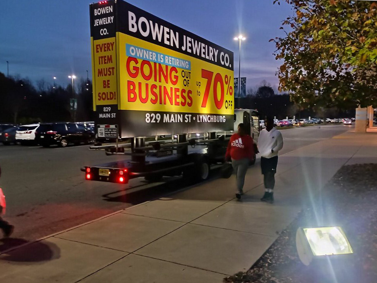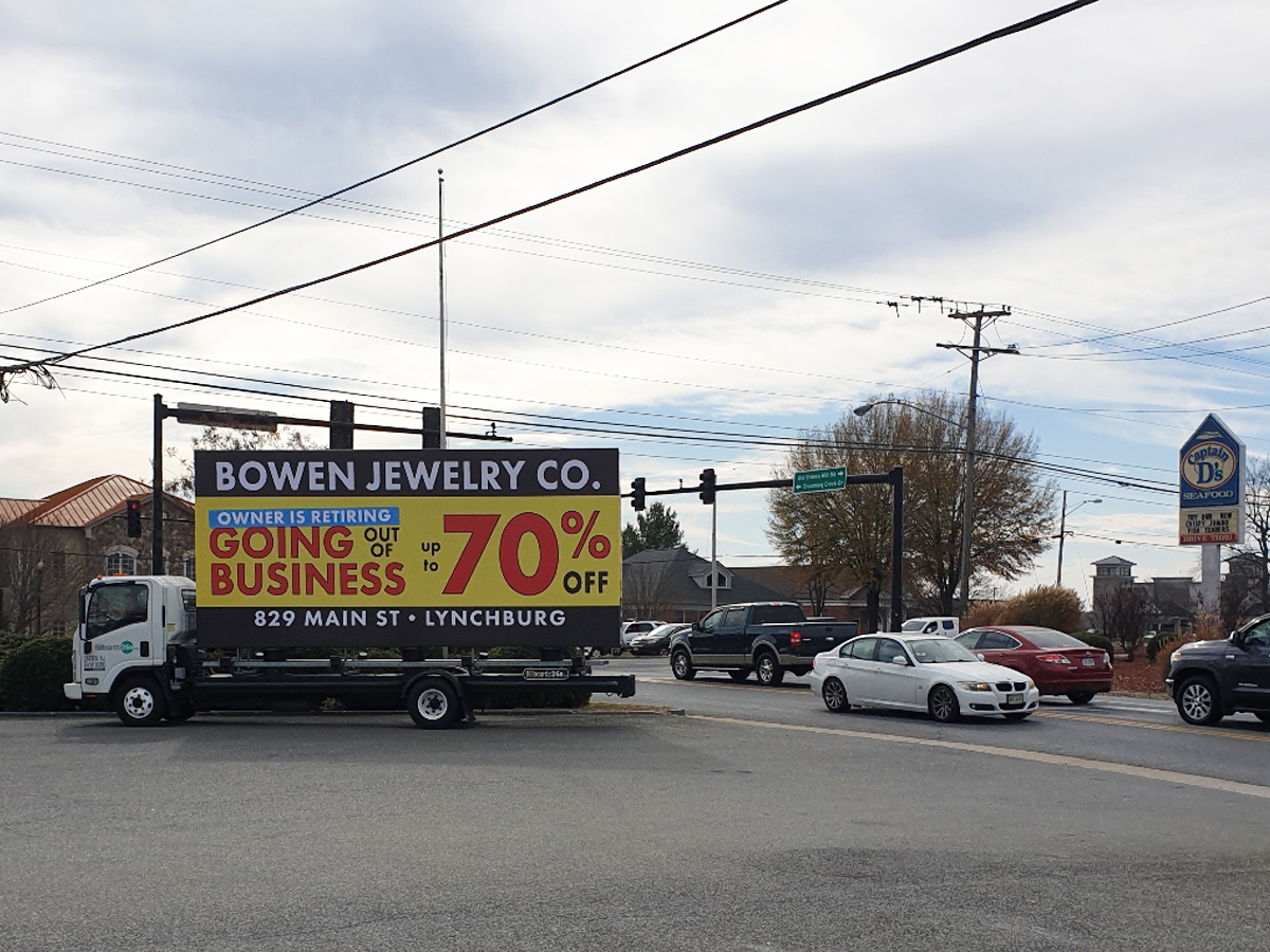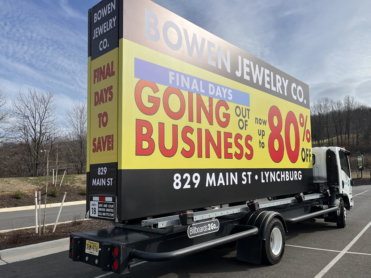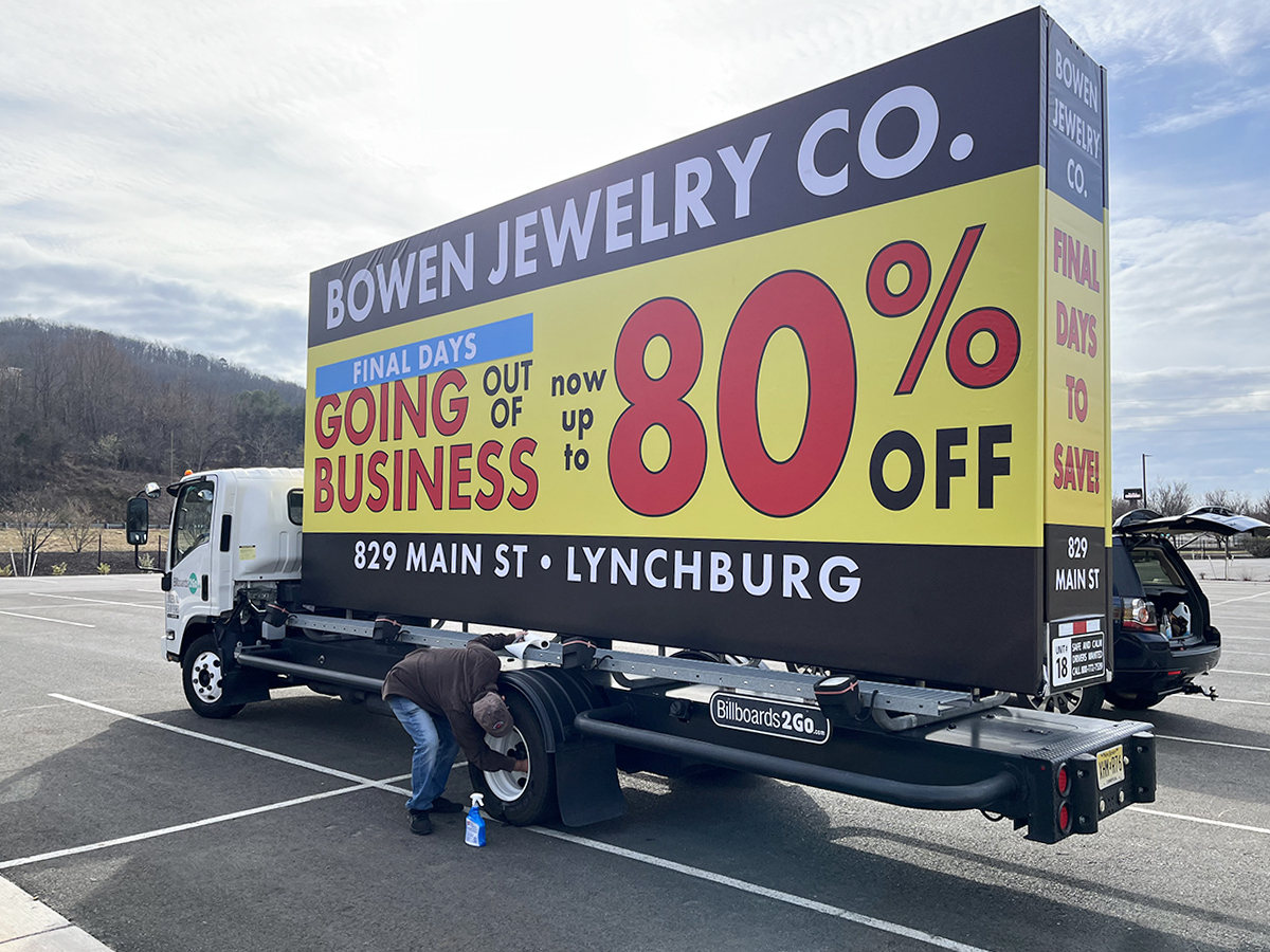 NOTE: 01/05/24 The conclusion of the Bowen mobile billboard campaign is running smoothly. A couple of photos below show the “80% OFF” unit getting exposure to the local strip malls.