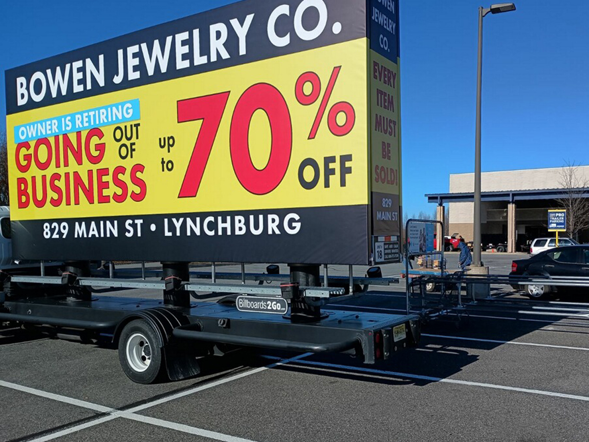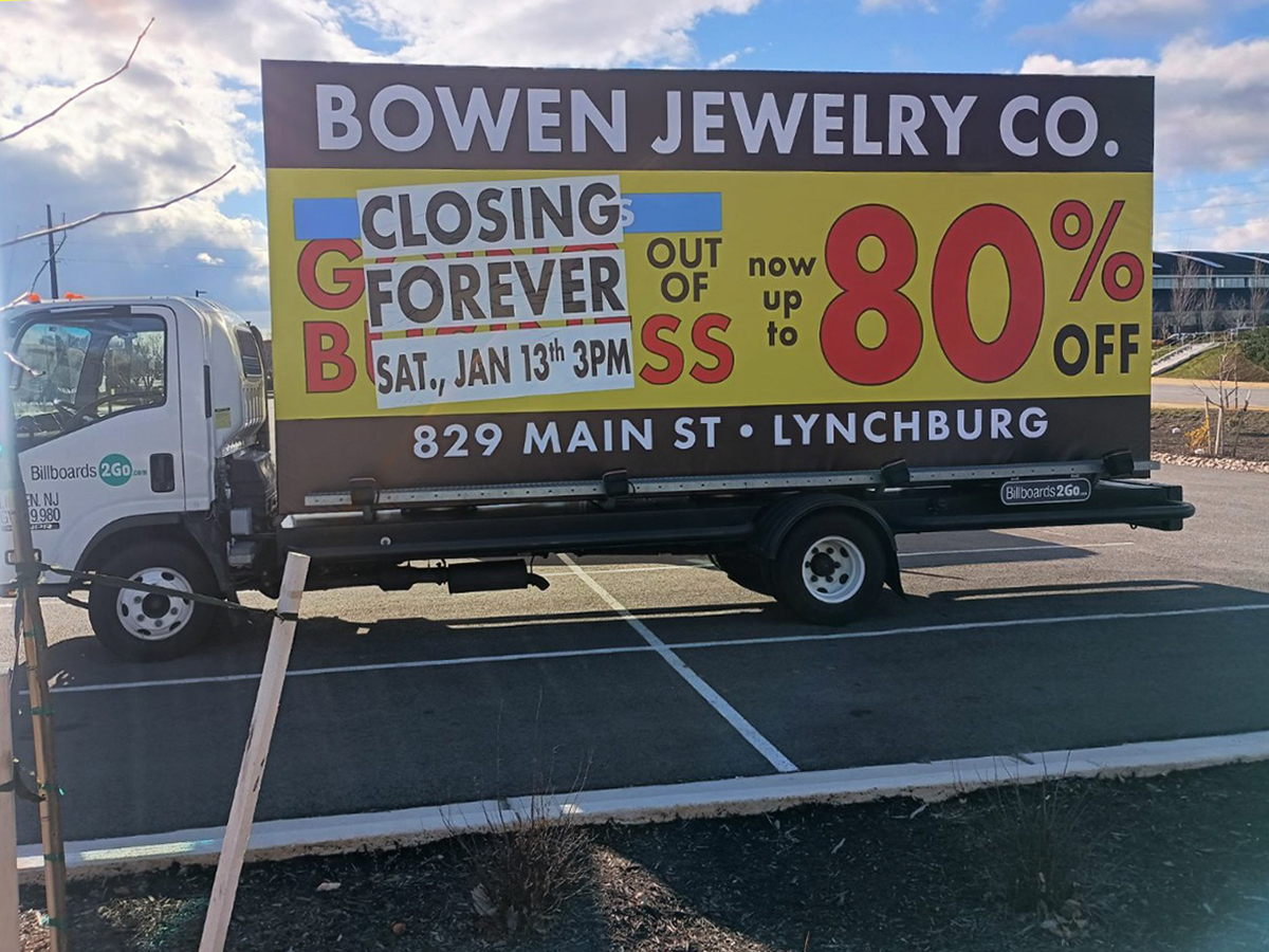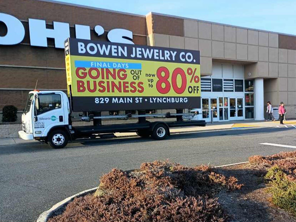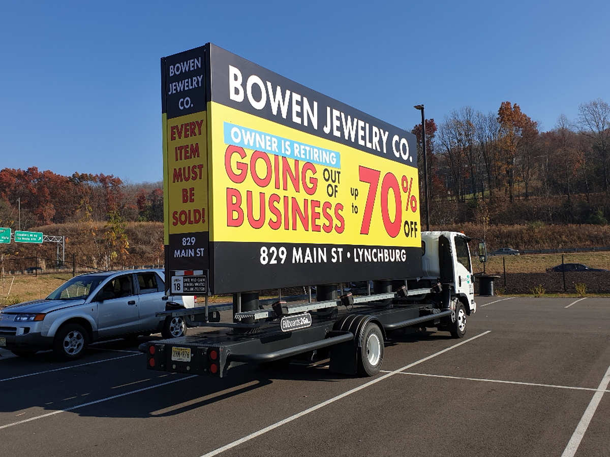 NOTE: 01/05/24 The conclusion of the Bowen mobile billboard campaign is running smoothly. A couple of photos below show the “80% OFF” unit getting exposure to the local strip malls.