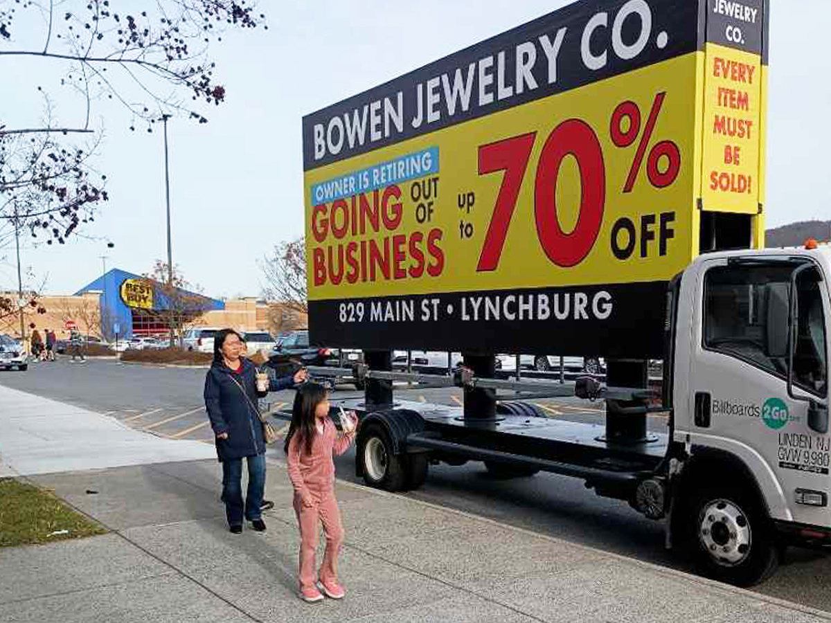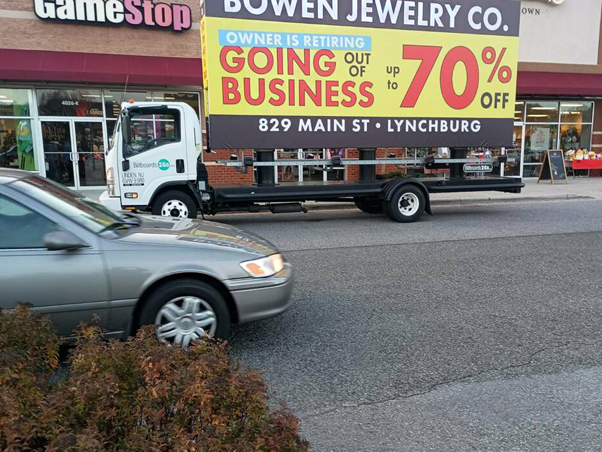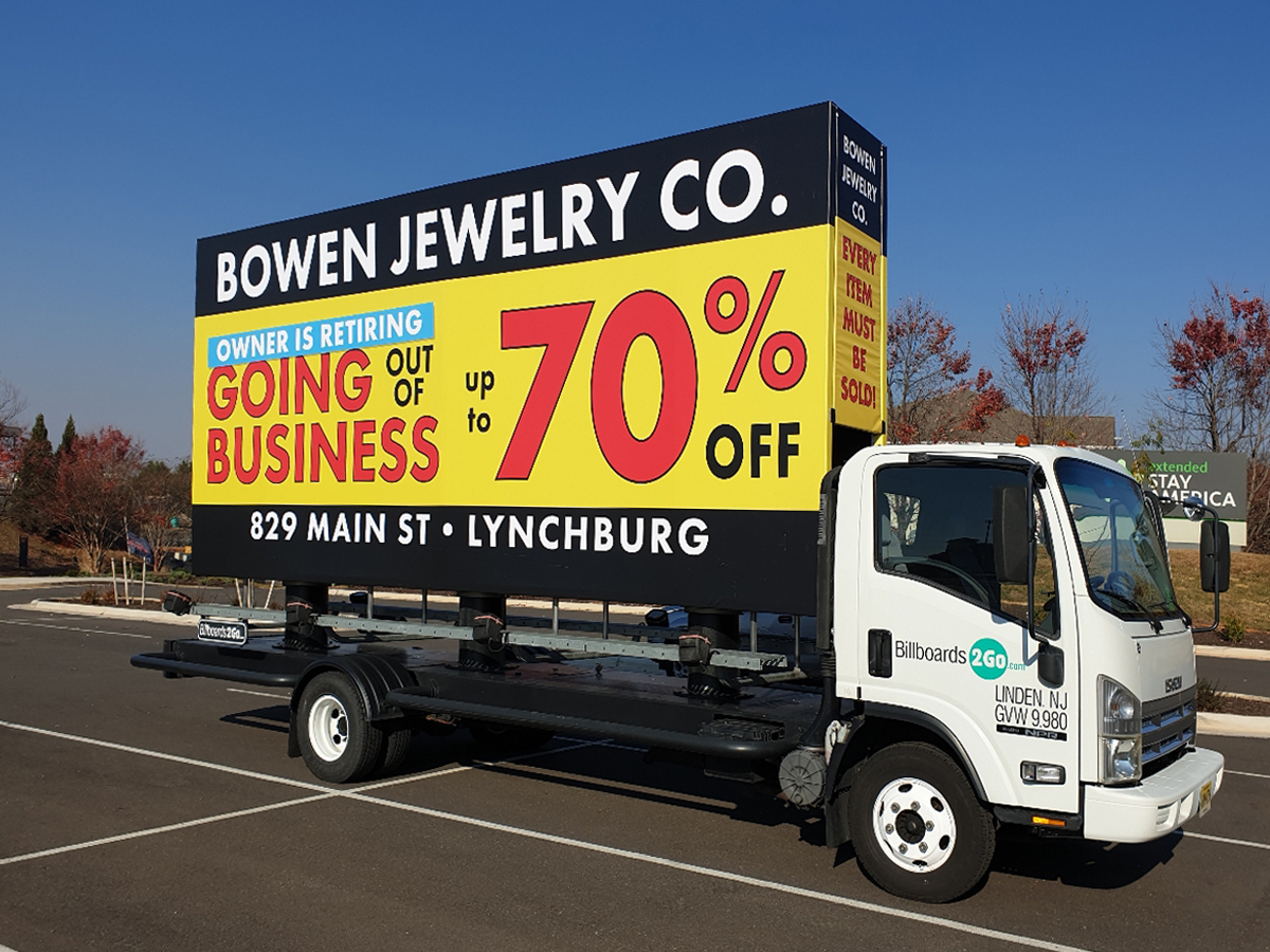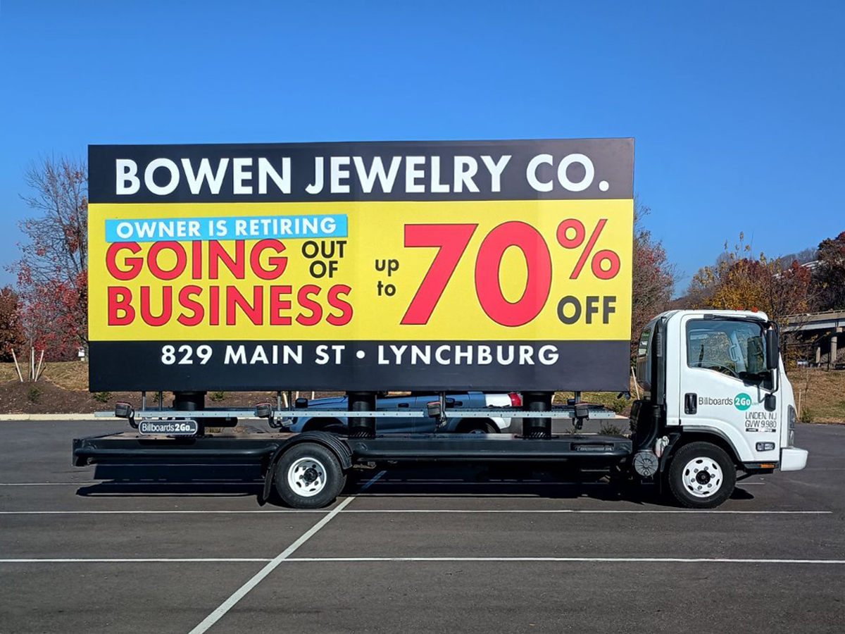 NOTE: 01/05/24 The conclusion of the Bowen mobile billboard campaign is running smoothly. A couple of photos below show the “80% OFF” unit getting exposure to the local strip malls.
