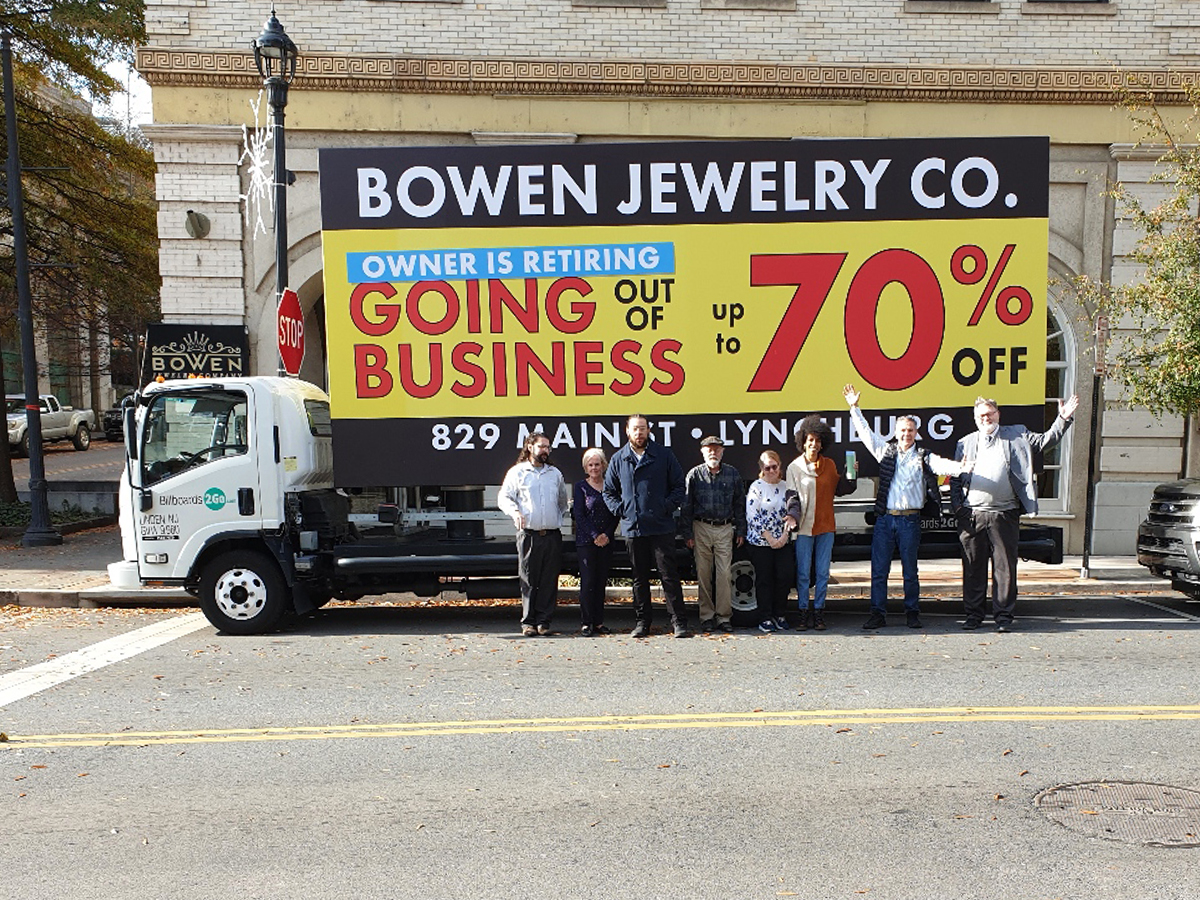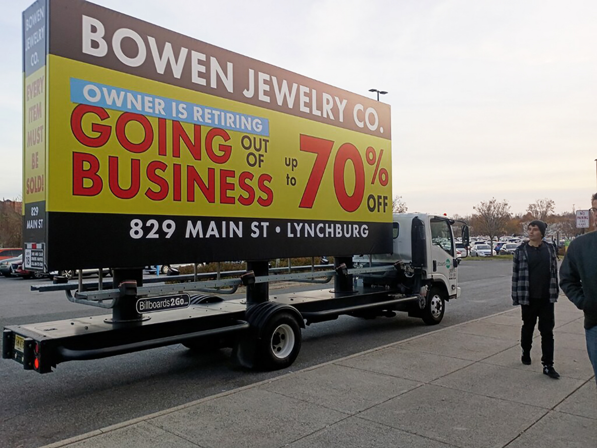 NOTE: 01/10/24 Attached is a photo of the Bowen mobile billboard sign, modified to display the “CLOSING FOREVER” message. Also, there’s a screenshot from this morning’s GPS tracking system, showing the unit’s route from 10 am to around 11 am. It’s evident that the driver is effectively promoting Bowen with excellent coverage. The campaign is scheduled to be completed on January 13th.