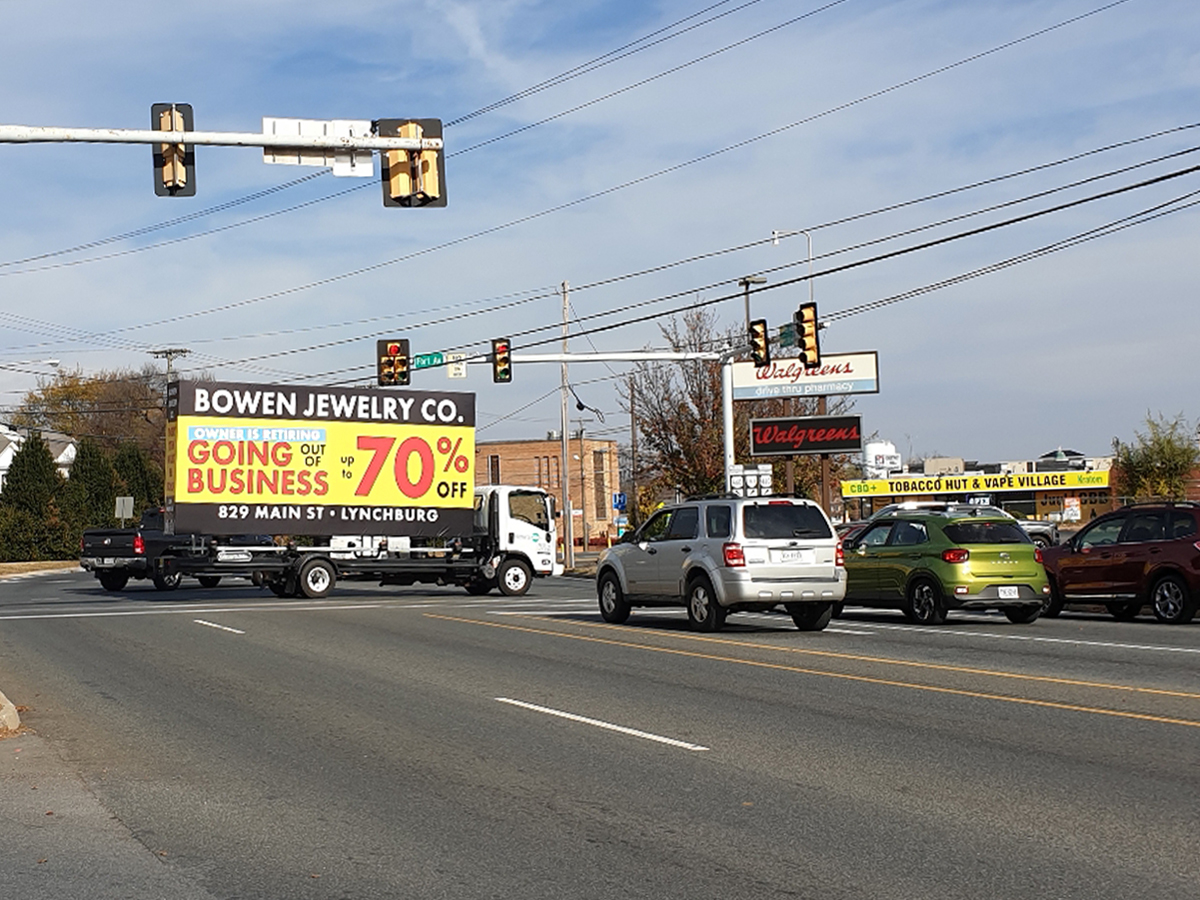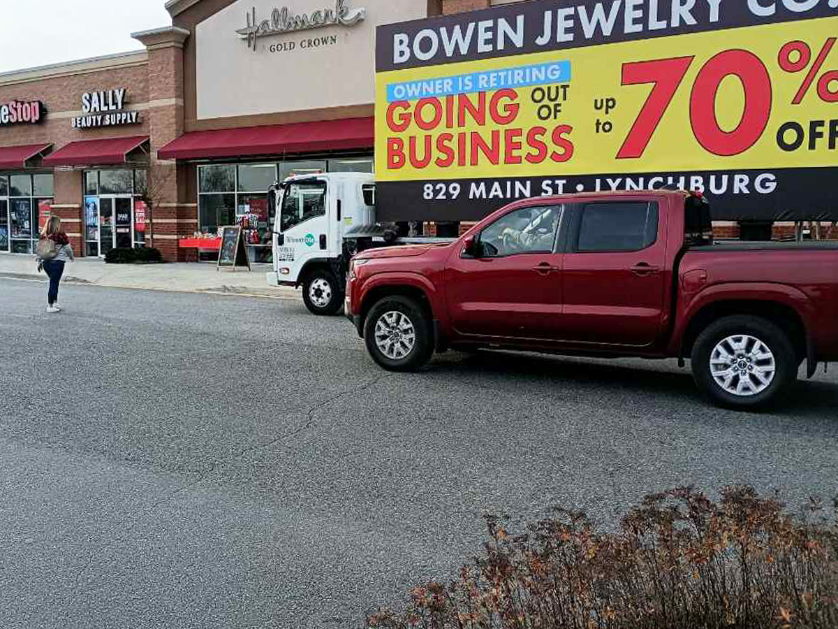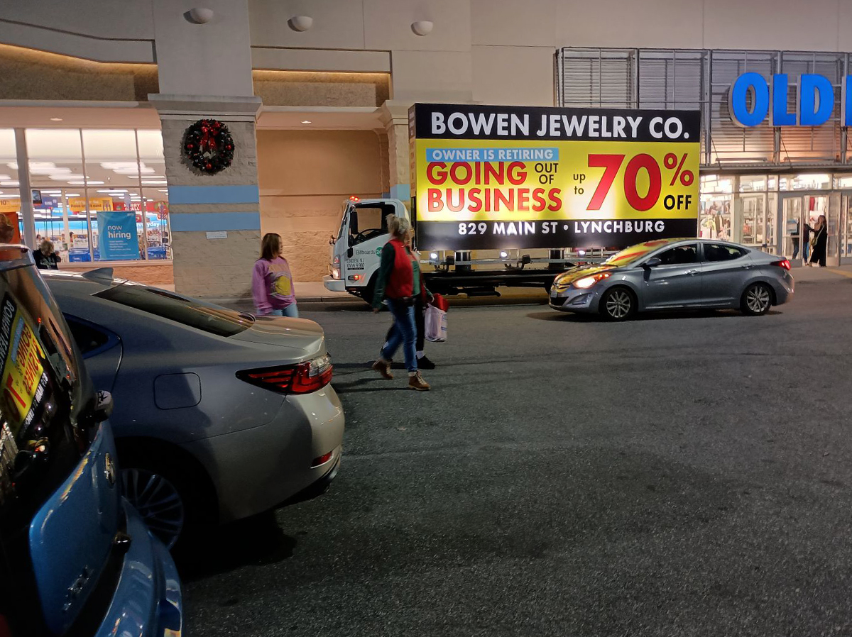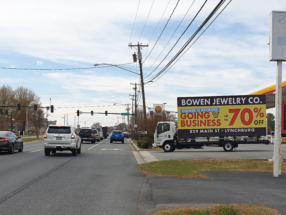 NOTE: 11/16/23 The photo below is just to show you what the client’s store in Lynchburg looks like. We’re excited to let you know that Billboards 2Go will launch the campaign next Monday on schedule. Right now, we don’t have photos of the billboard with the banners, but they’ll be posted in the local parking facility near Lynchburg this weekend. We were supplied a map that tells us where to focus for more visibility, and the driver will aim for prime spots in those areas. On the first day, the driver will stop by the store to meet Bill King, and we plan to make regular stops throughout the day for local exposure, every day. Once the billboard is up and we have some pictures, they’ll be posted on the client portal.
