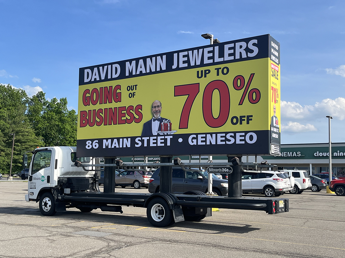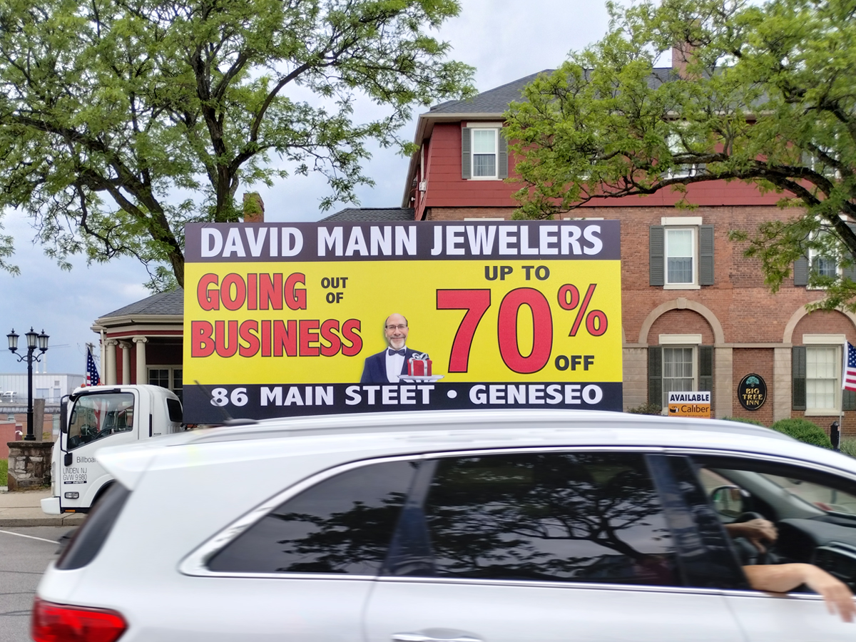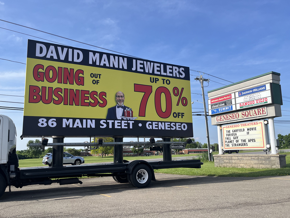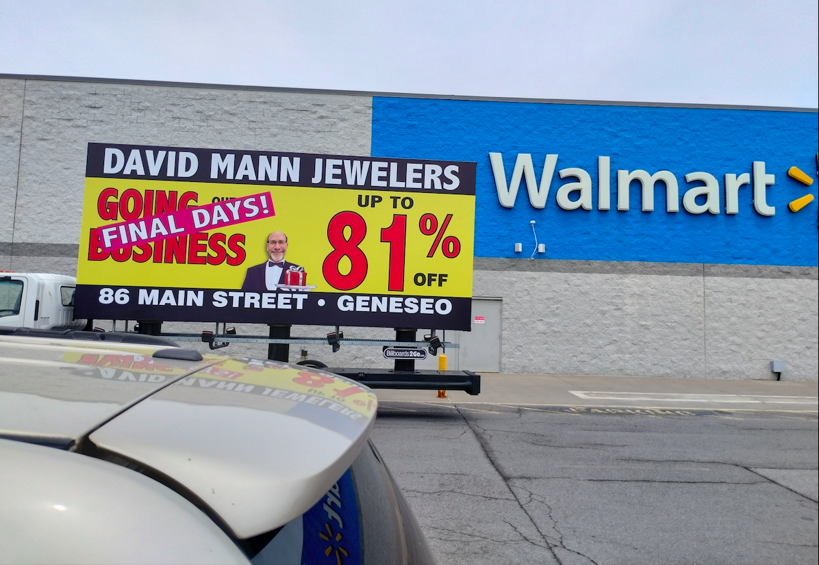 NOTE: 05/28/24 The David Mann Jewelry Sale campaign kicked off right on time Memorial Day morning in the target market area. Russell met with Robert in Geneseo and introduced Kris, our dedicated billboard operator. Robert was really impressed with the display and looked forward to the Tuesday morning meeting, asking Kris to be at the store at 10:00 AM. – The GPS access for this campaign is the same as for the Cliffside Park campaign. At the Reveal site, you can track both campaigns using the same map tracking feature.